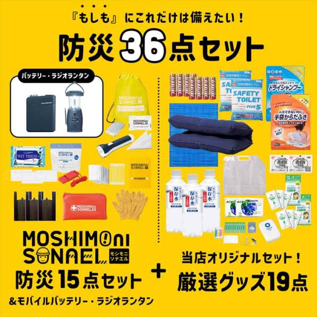 防災セット 1人用 モシモニソナエル 36点セット 避難セット 防災グッズ 中身だけ 災害対策グッズ 避難用品 非常用持出袋 防災士監修 保存水 長期保存 7年間 備蓄 モバイルバッテリー 充電器 携帯トイレ 目隠し ライト ホイッスル LEDランタン ラジオ 電池式 手回し ソーラー