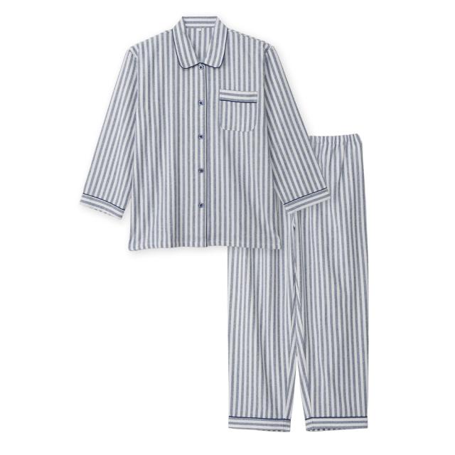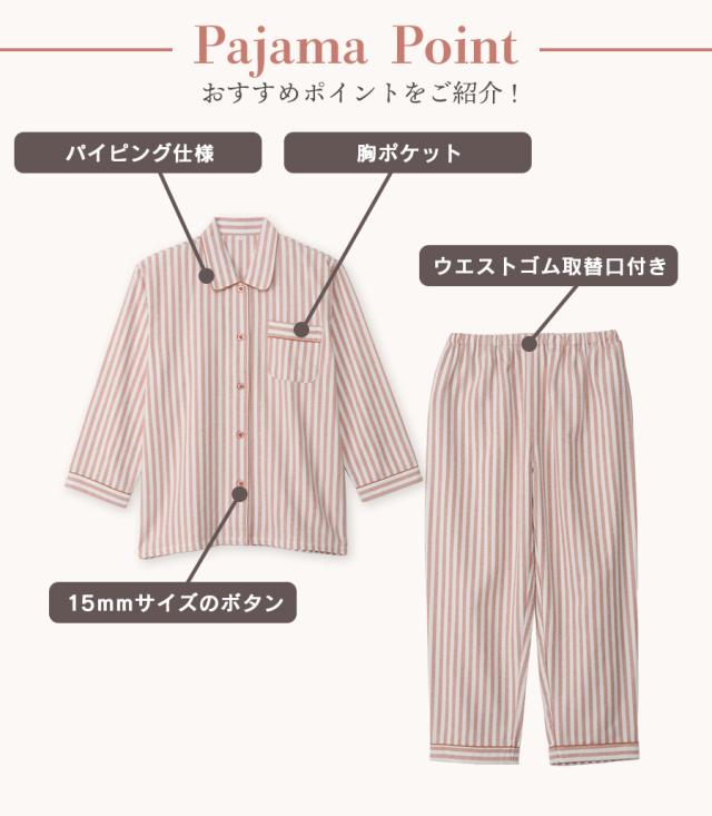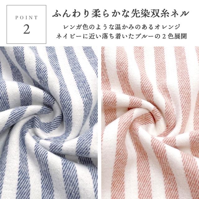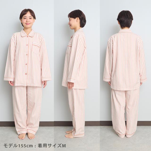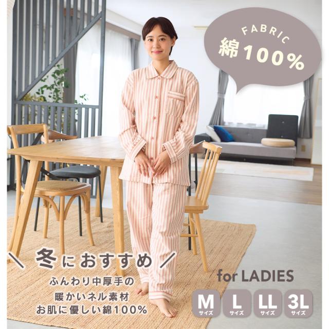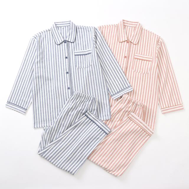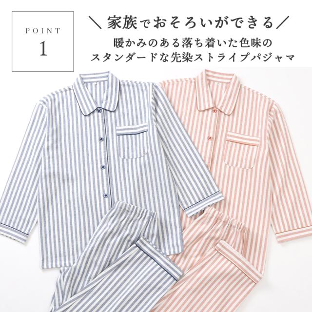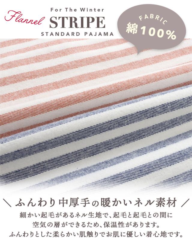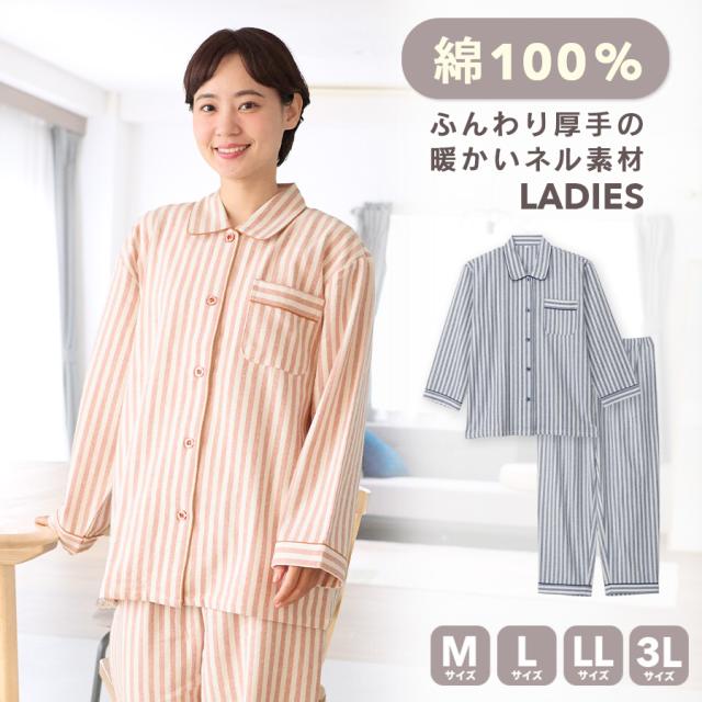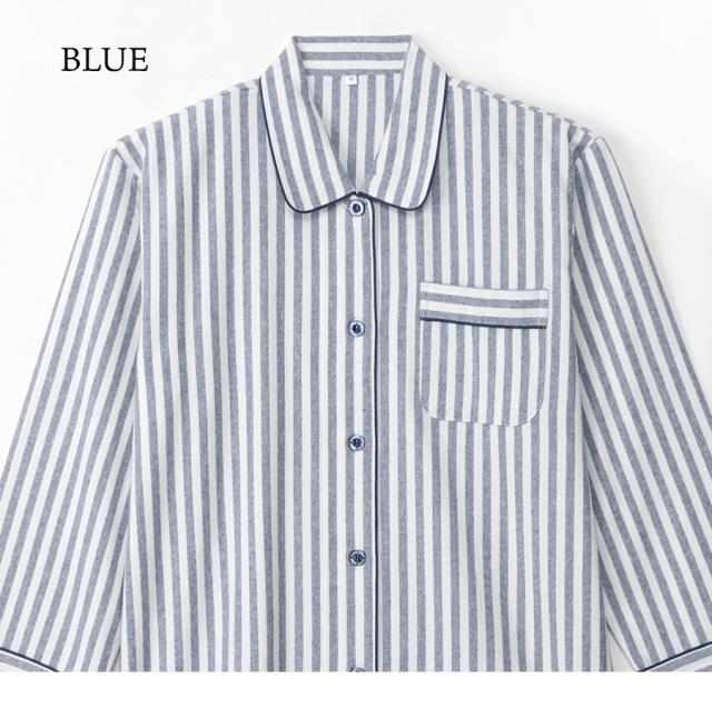 パジャマ レディース 綿100% 長袖 秋 冬 前開き ボタン 中厚手のネル起毛 先染め ストライプ柄 ブルー オレンジ M L LL 3L 親子 おそろい リンクコーデ 家族 ギフト プレゼント 敬老の日 母の日 61988