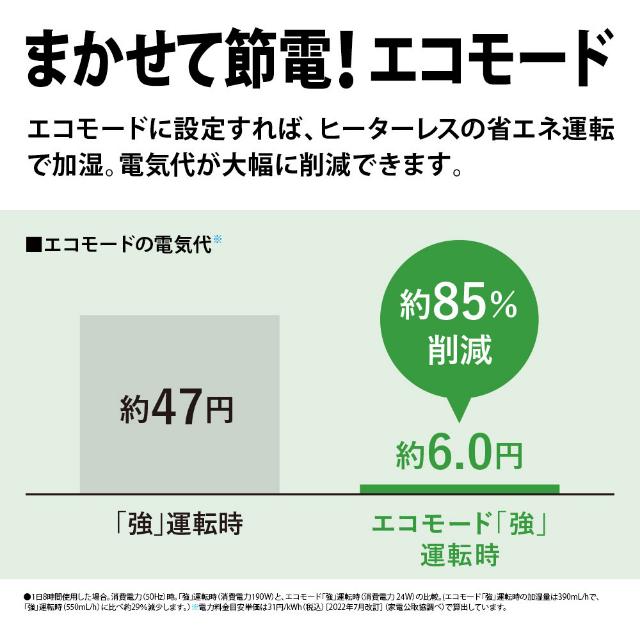 ---------------------------------※2 商品を壁際に置いて、「強」運転時にプラズマクラスター適用床面積の部屋中央(床上1.2m)で7000個cm3のイオンが測定できる床面積の目安です。 ※3 室温30℃のとき。 ※4 電力料金目安単価は31円/kWh(税込)[2022年7月改訂](家電公取協調べ)で算出しています。 ※5 ---------------------------------