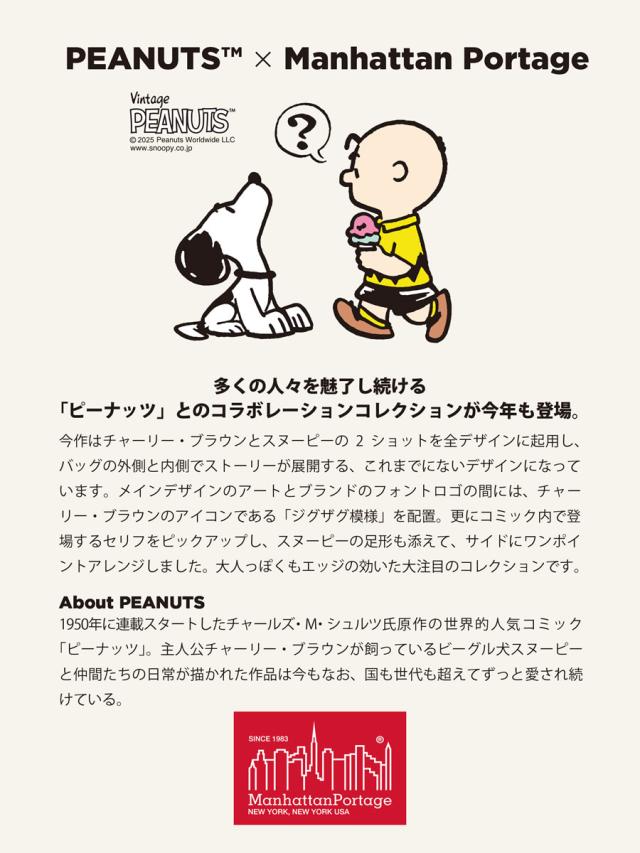 | ■Manhattan Portage マンハッタンポーテージ 商品詳細 世界中で愛され続ける「PEANUTS(ピーナッツ)」との特別なコラボレーションコレクションが、今年もついに登場いたしました。 今回のシリーズでは、チャーリー・ブラウンとスヌーピーのアイコニックな2ショットを全てのデザインに採用し、バッグの外側と内側で異なるストーリーが展開されるという、これまでにないクリエイティブで遊び心にあふれた仕上がりとなっています。 外側には刺繍によって丁寧に表現されたメインアートとブランドロゴの間に、チャーリー・ブラウンを象徴するジグザグ模様をさりげなく配置し、さらにコミック内のセリフやスヌーピーの足跡モチーフを組み合わせることで、シンプルながら見れば見るほど楽しく、大人のカジュアルスタイルにも自然に馴染むエッジの効いたデザインを実現しました。 素材には、なめらかで光沢感があり高級感を漂わせるナイロンツイルを採用し、ショルダーストラップには柔らかく肩に負担がかかりにくいナイロンテープを使用。 トップ部分は体にしっかりとフィットする湾曲デザイン、ボトム部分はスクエア型で書類やタブレットの収納に適しており、機能性も抜群です。 さらに、左側面にはさっと取り出せるオープンポケット、右側面には防犯性に優れたジッパーポケットを配置。広々としたメインコンパートメントはダブルジップ仕様で開閉しやすく、B5サイズが収納可能なうえ、内側にはジップ付きポケットも備えられているため、鍵や小物類も整理しやすい仕様です。 PEANUTSファンはもちろん、スヌーピーの世界観をさりげなく取り入れたい大人の方や、デザイン性と機能性を両立させたバッグを探している方におすすめのコレクション。 日常使いから通勤・通学、休日のお出かけまで幅広いシーンで活躍し、長く愛用できるアイテムとなっています。 大注目の「スヌーピー コラボバッグ」で、この機会にぜひ特別なアイテムを手に入れてください。 |