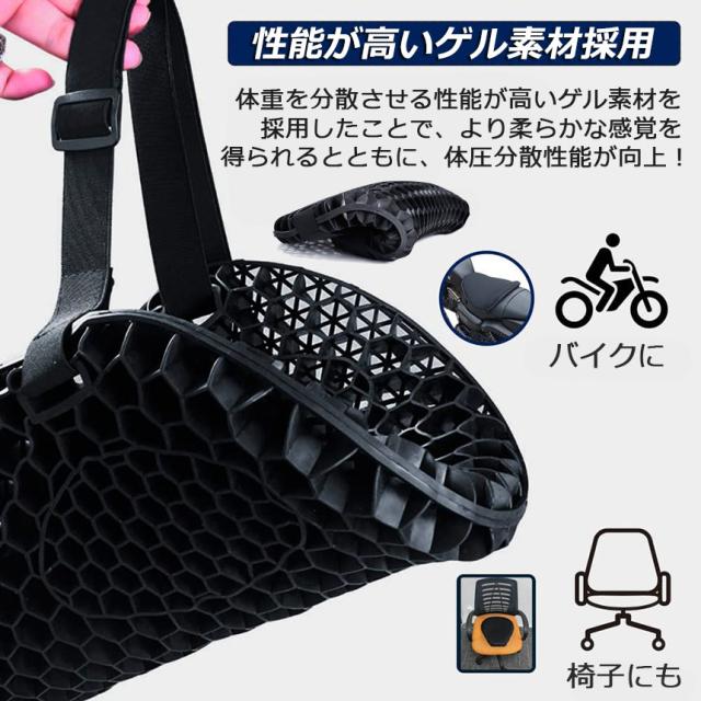 【ハニカム構造】:ハニカム構造を採用して、体重を分散させる性能が高いゲル素材採用したことで、より柔らかな感覚を得られるとともに、体圧分散性能が向上!。春、夏、秋、冬と便利に使える、弾力性はスポンジよりもはるかに高くて、ちゃんとお尻と腰をしっかり支えます。厚さは3.5cmでちゃんと衝撃を吸収し、振動も軽減でき、お尻や腰を保護し、長時間座っても疲れにくいです。
