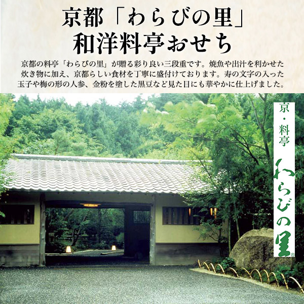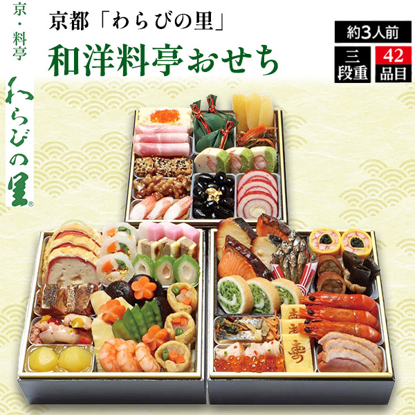 和洋料亭 おせち 約3人前 京都 「わらびの里」 42品目 3段重 焼き魚 出汁を利かせた焼き物など 12/29〜12/30 お届け予定 【ご注文締め切り:12/16】 オードブル 前菜 肉 魚 海老 おせち料理 豪華 盛り合わせ 詰合せ お重おせち 重箱 和風 洋風 京料理 料亭おせち