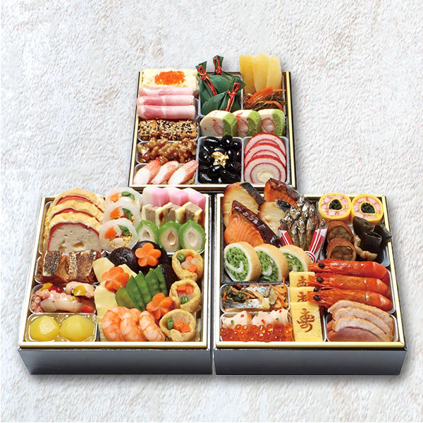 寿の文字の入った玉子や梅の形の人参、金粉を塗した黒豆など見た目にも華やかに仕上げました。