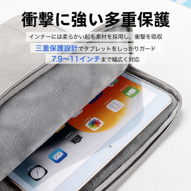 柔らかい起毛素材インナーで衝撃を吸収。三重保護設計でタブレットをしっかりガード。7.9〜11インチまで対応。