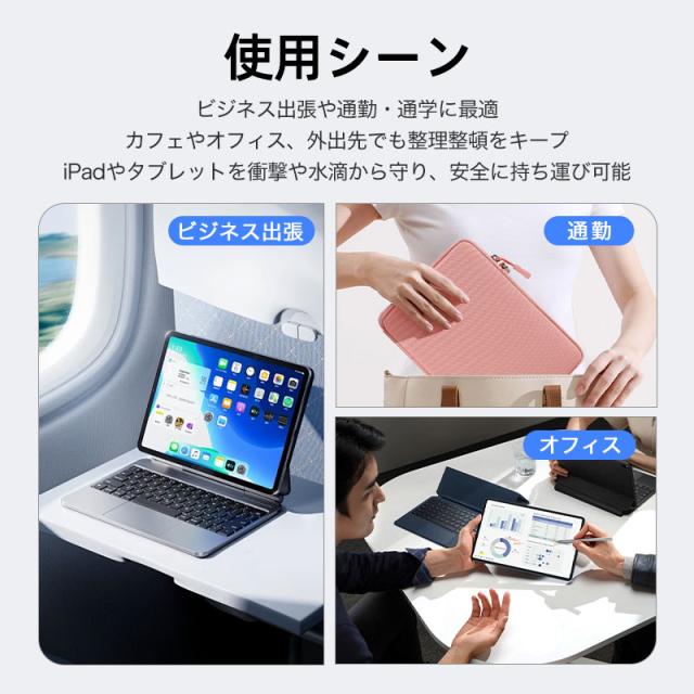 薄型・軽量で持ち運びやすい、ビジネスや出張に最適なiPad収納ケース。撥水加工済みで雨や水滴からタブレットを守り、ストラップ付きで持ち運びも快適です。