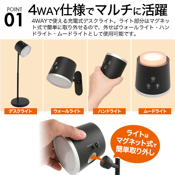 4WAYで使える 充電式LEDデスクライト ランプ型