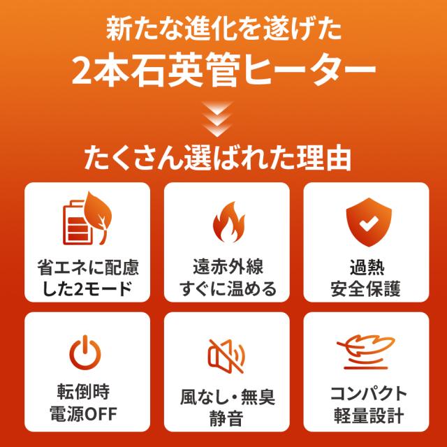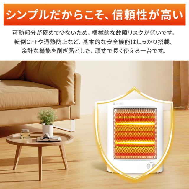 安全性を考慮し、万が一の転倒時には自動で電源がオフになる設計。過熱時にも停止するため、小さなお子様や高齢者のいるご家庭でも安心してご使用いただけます。