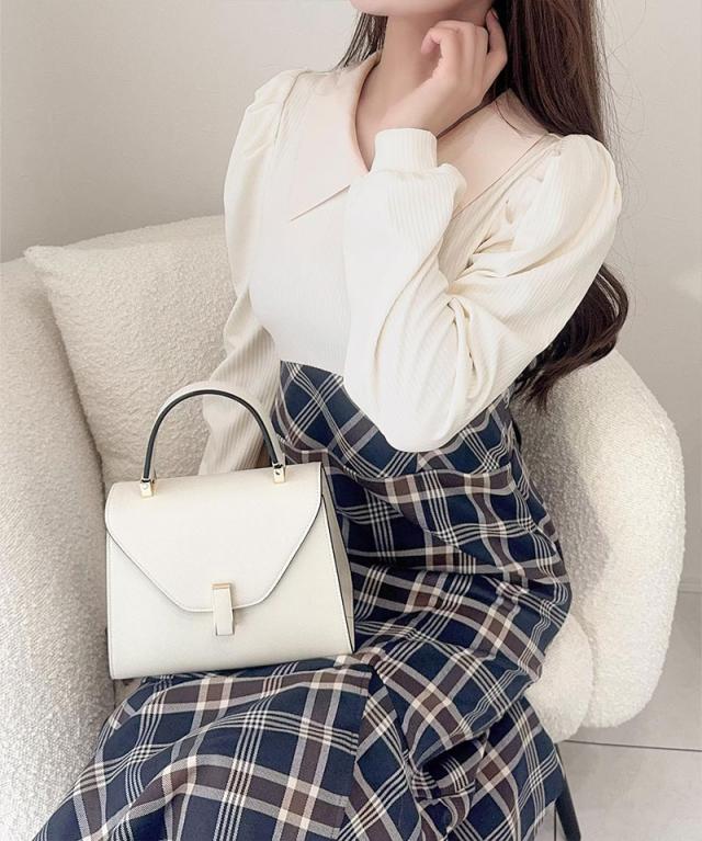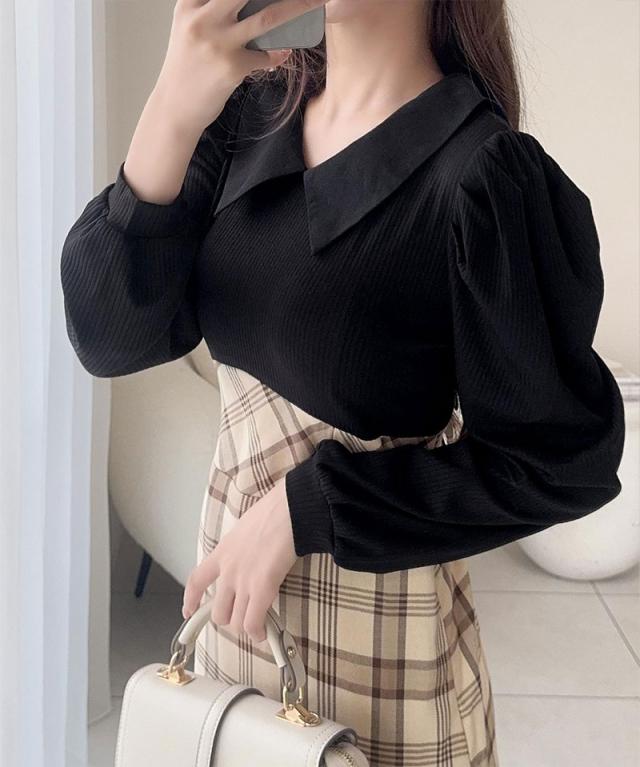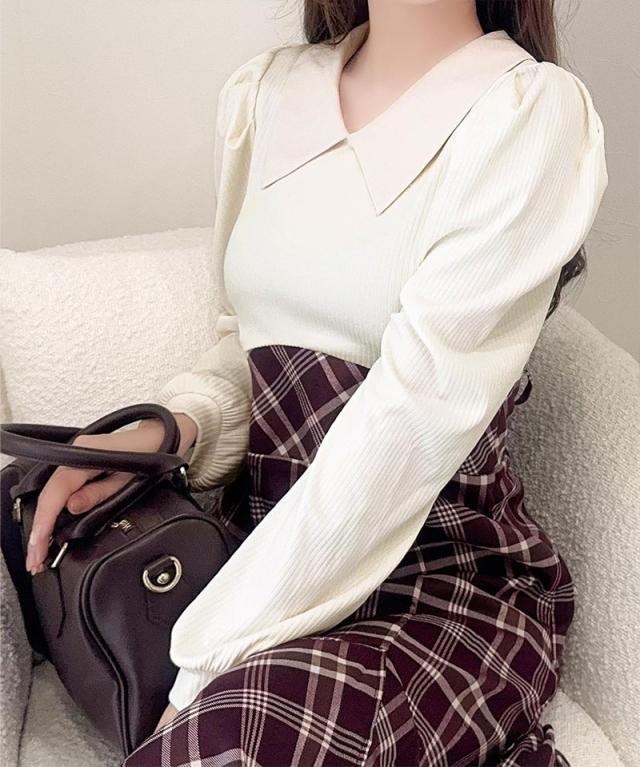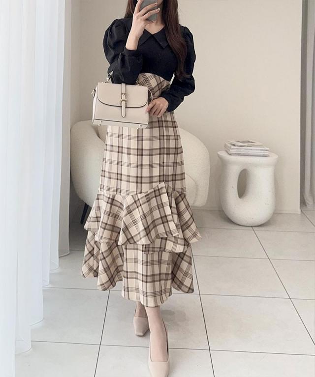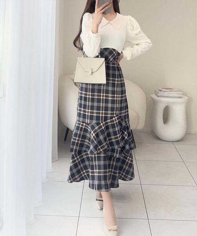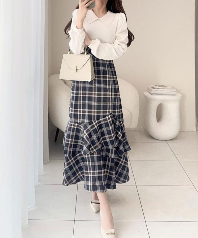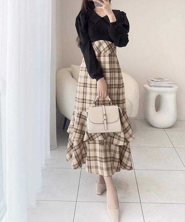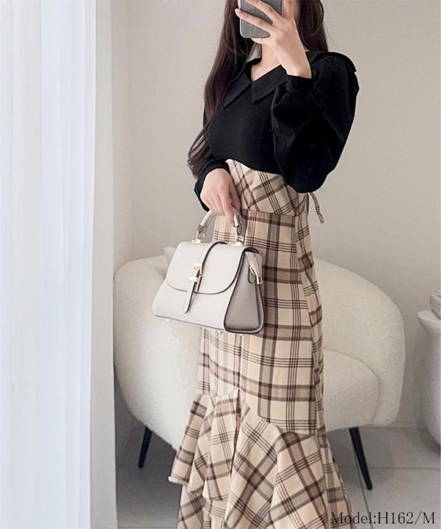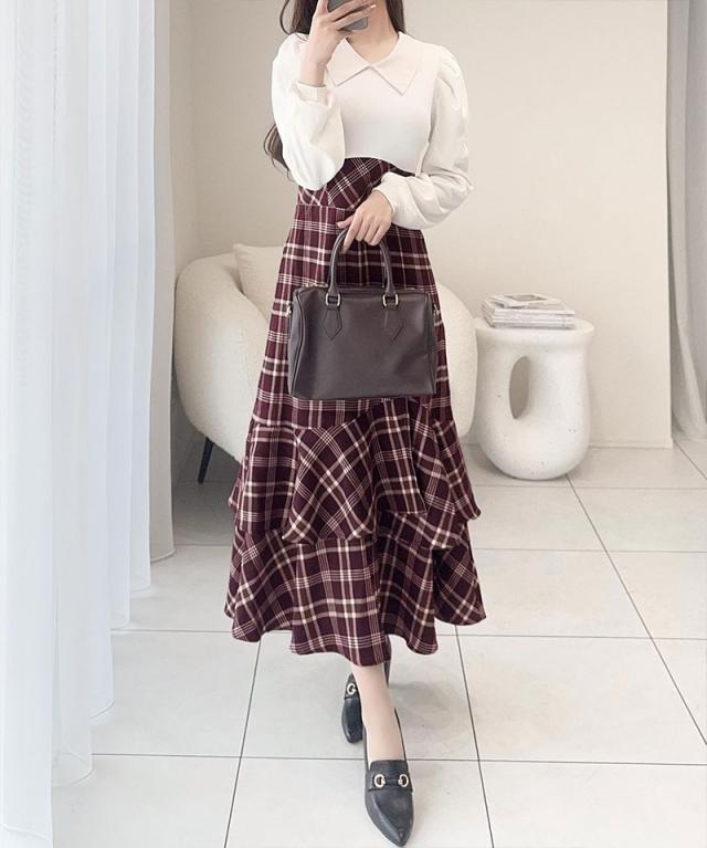 レトロなチェック柄のフレアスカートとのドッキングワンピース。