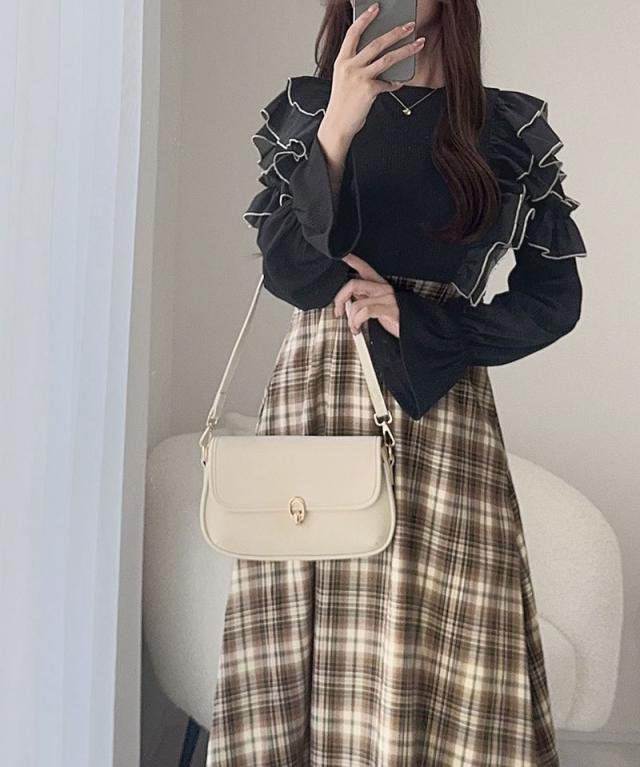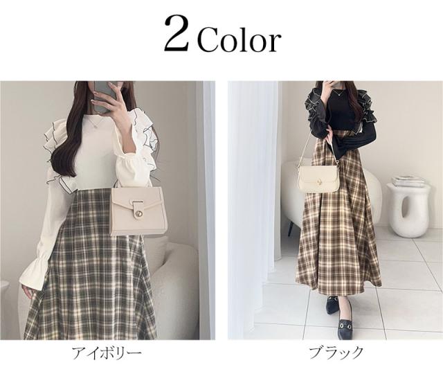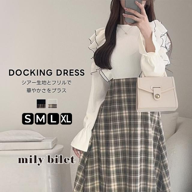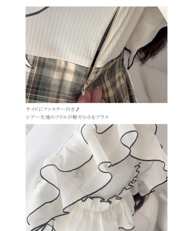 クラシカルエルフ冬新作 mily bilet ワンピース 秋 レディース きれいめ シアー フリル 華やか ドッキングワンピース チェック柄 スカート リブ素材 キャンディースリーブ ガーリー 肩フリル 可愛らしさ お洒落 柔らか 大きいサイズ 2025aw mi1139089