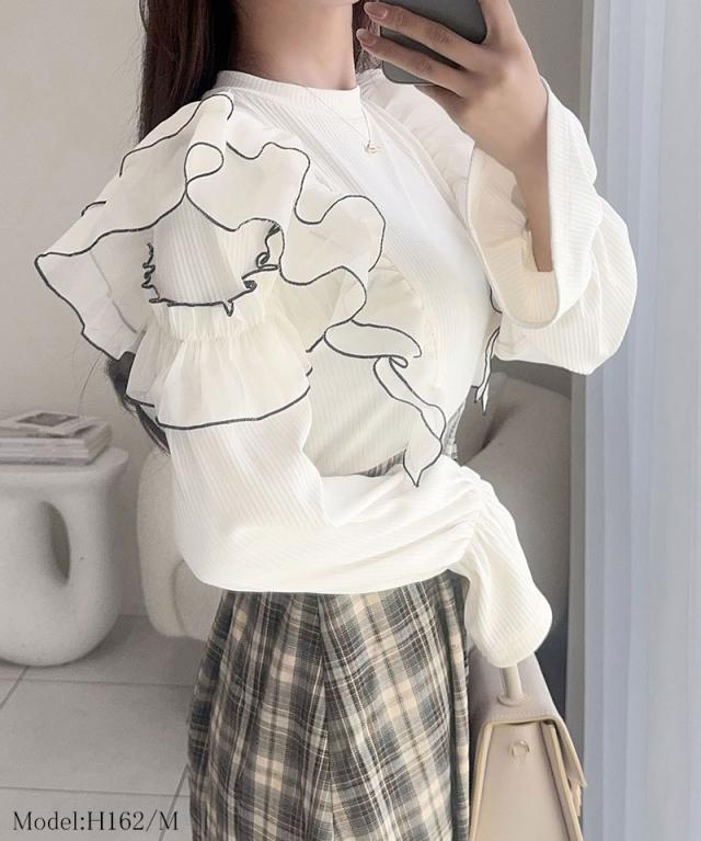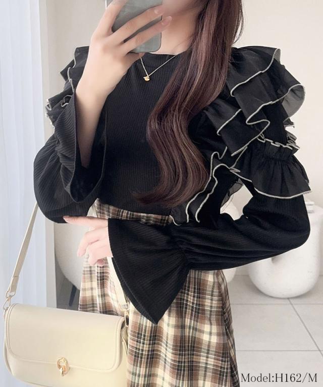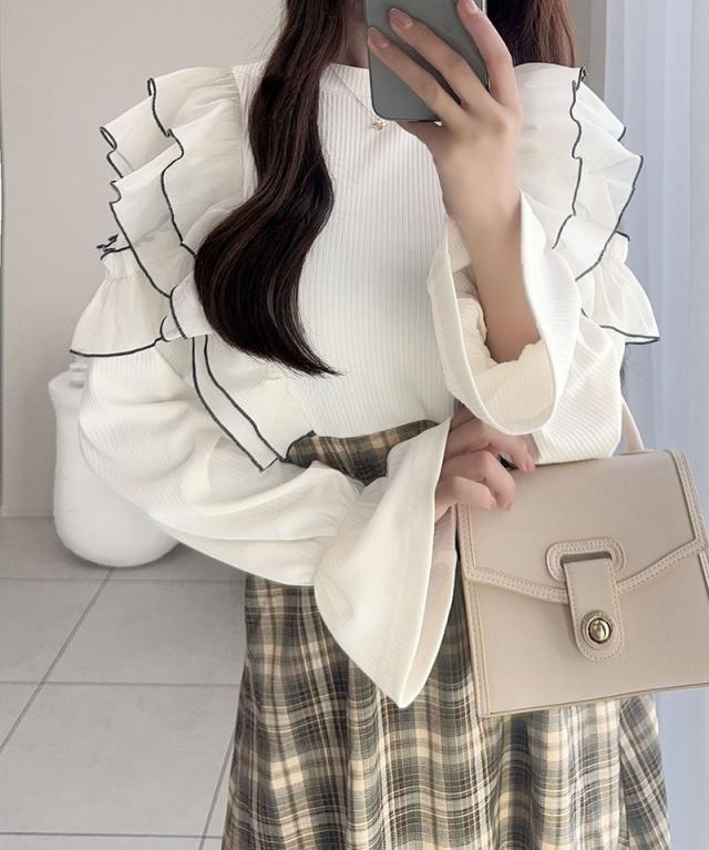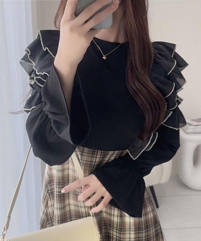 プチハイネックとキャンディースリーブが可愛らしさを引き立て、シアー生地のフリルが軽やかさをプラス。