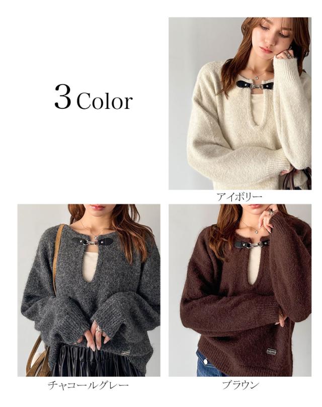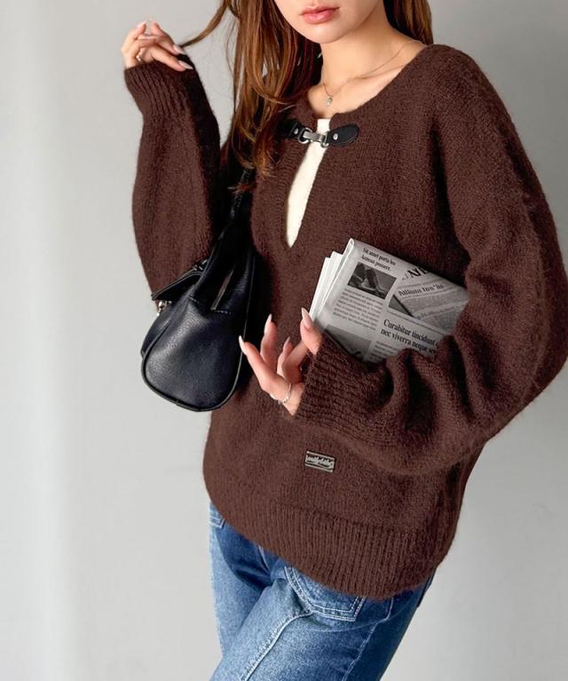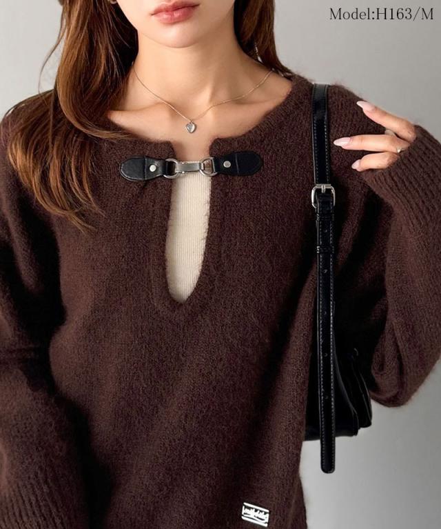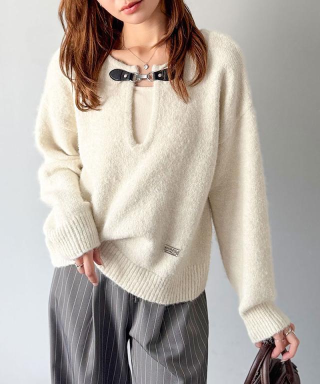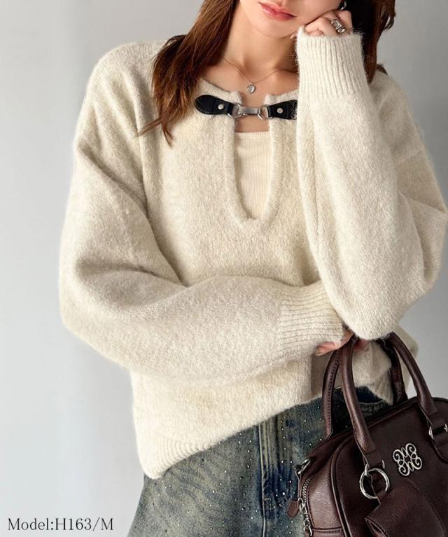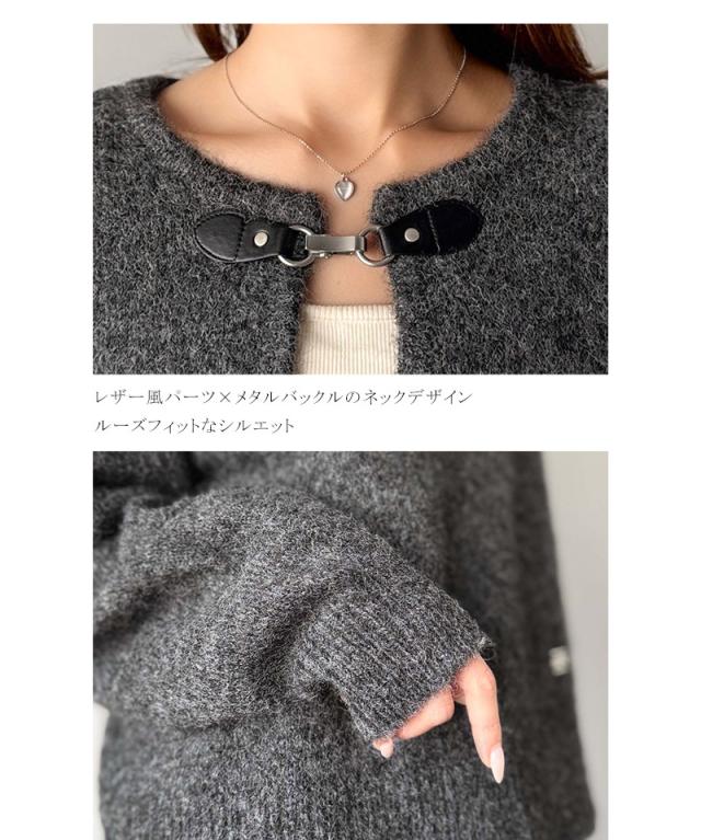 クラシカルエルフ冬新作 mily bilet トップス ニット レディース 長袖 Vネック モヘアタッチ レザー風パーツ メタルバックル ふんわり ニット素材 ルーズフィット 主役級 抜け感 カジュアル きれいめ 柔らかい 癒し アクセント 大きいサイズ 2025aw mi1029138