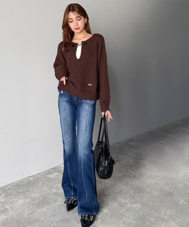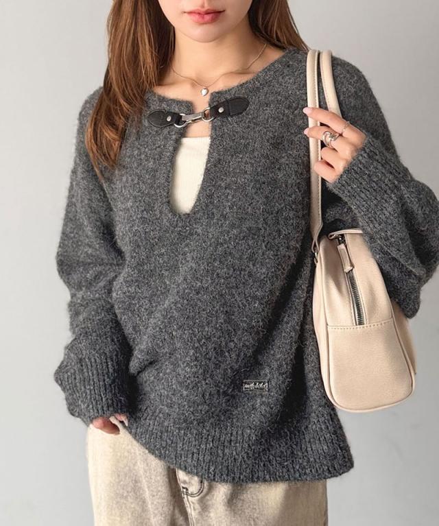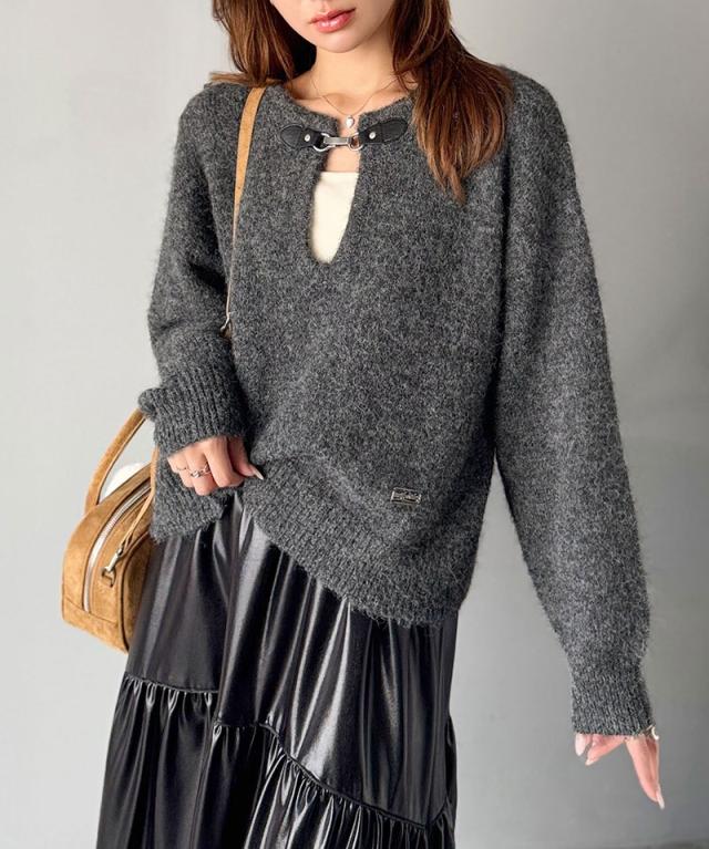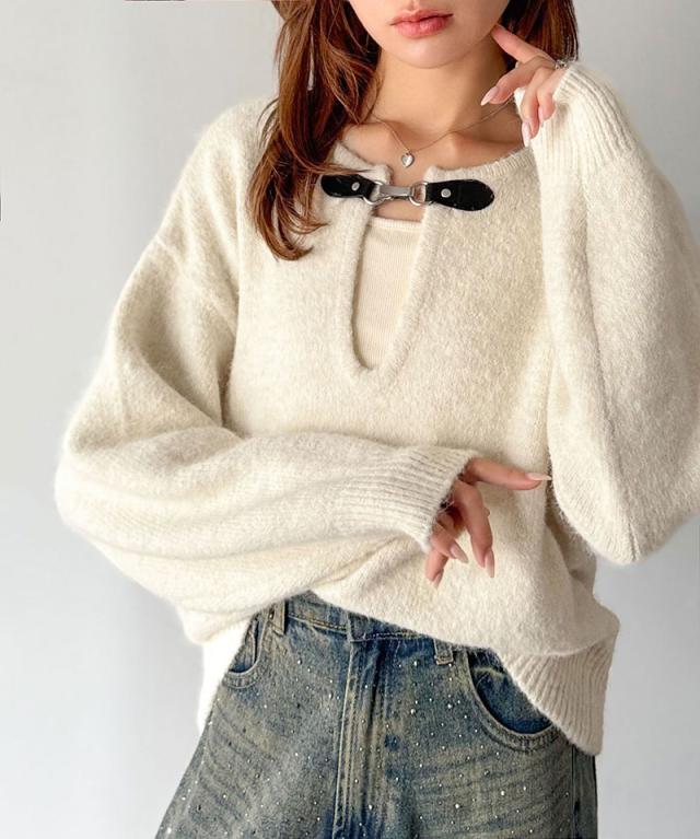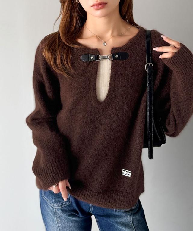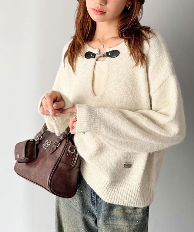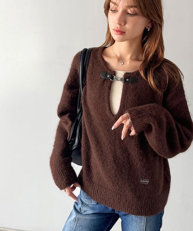 クラシカルエルフ冬新作 mily bilet トップス ニット レディース 長袖 Vネック モヘアタッチ レザー風パーツ メタルバックル ふんわり ニット素材 ルーズフィット 主役級 抜け感 カジュアル きれいめ 柔らかい 癒し アクセント 大きいサイズ 2025aw mi1029138