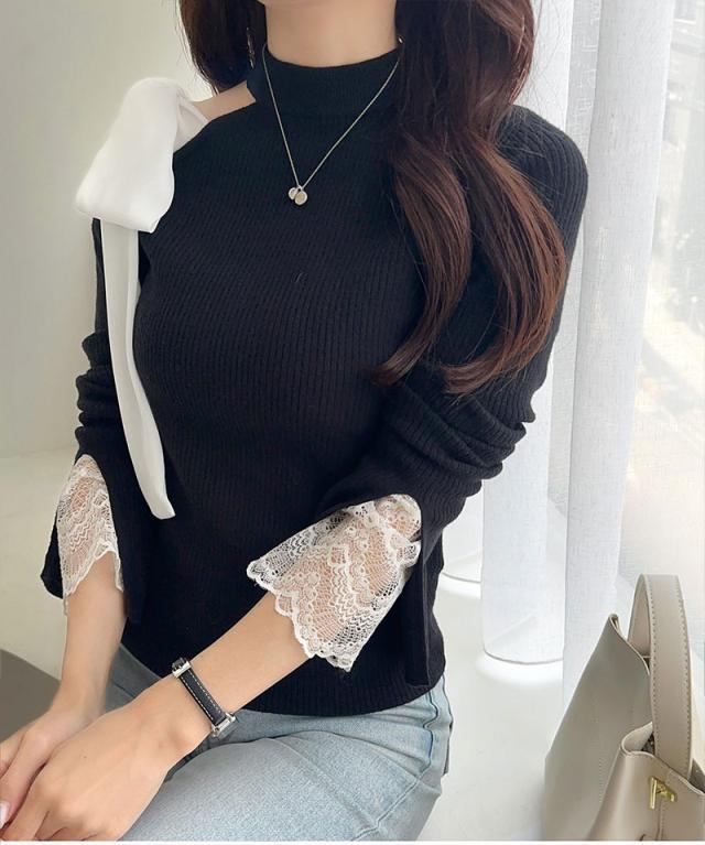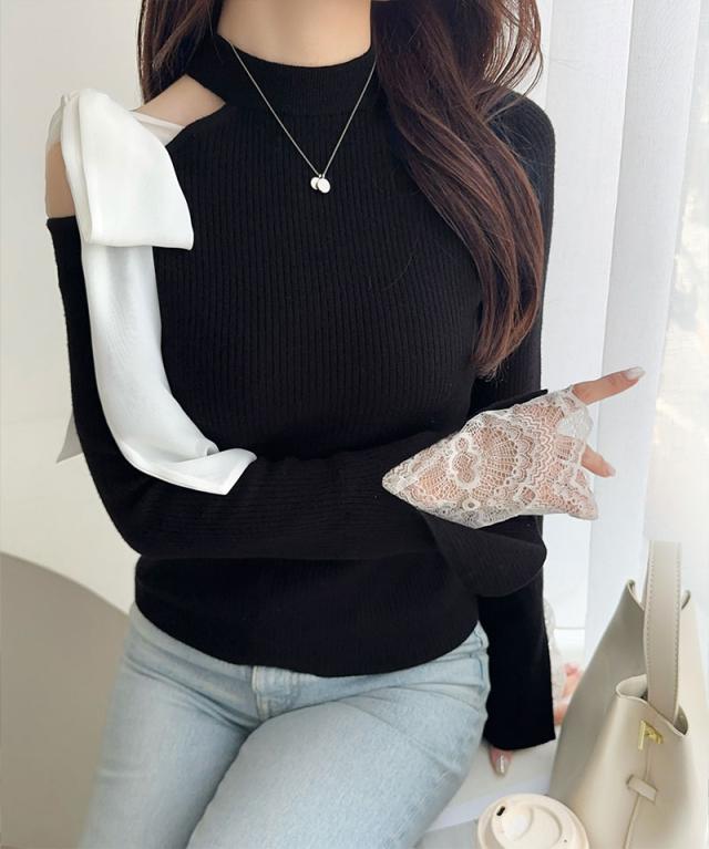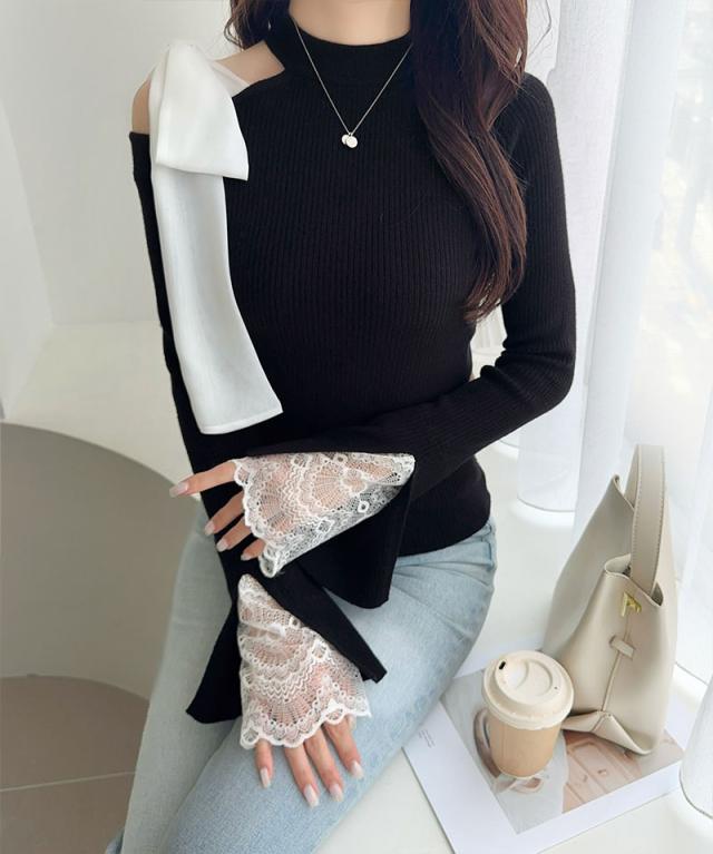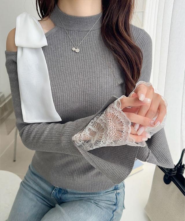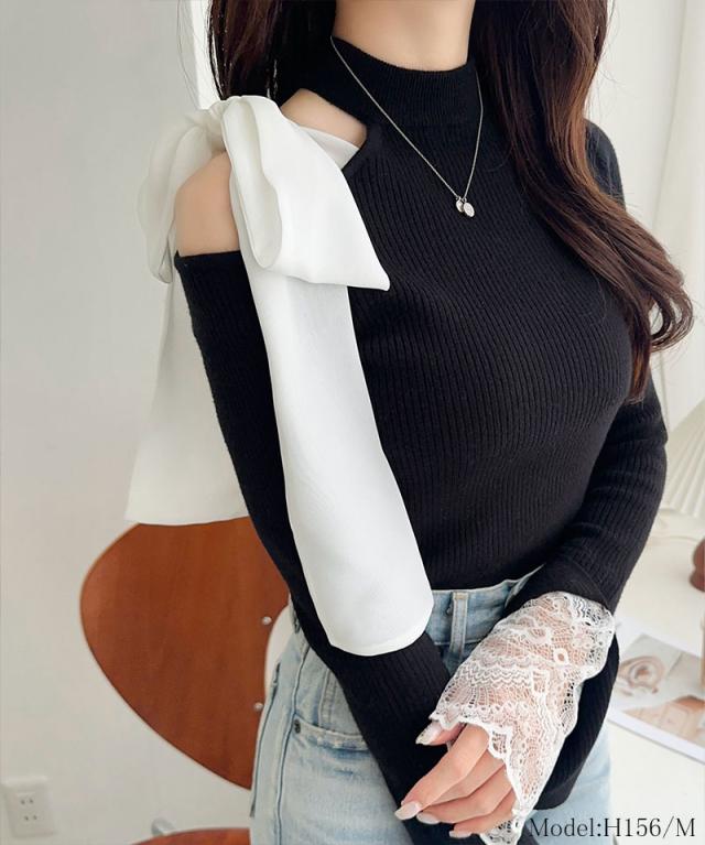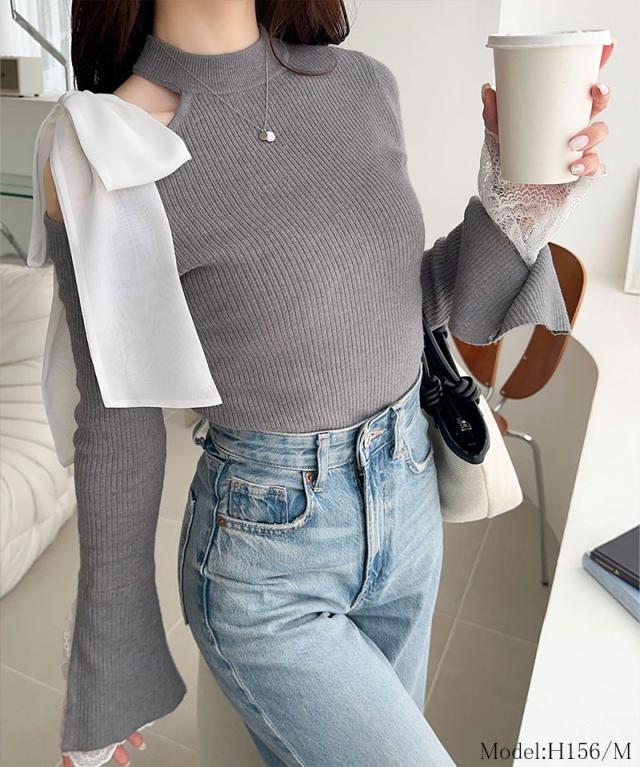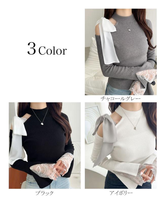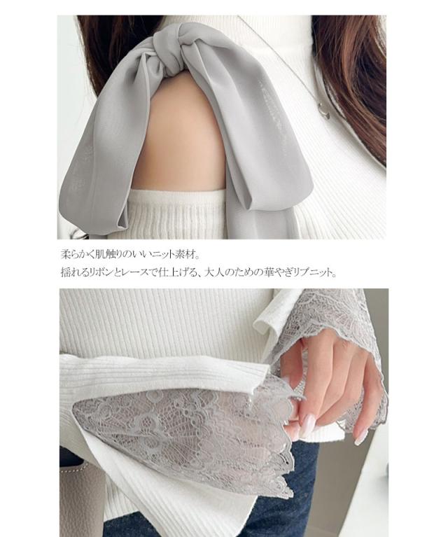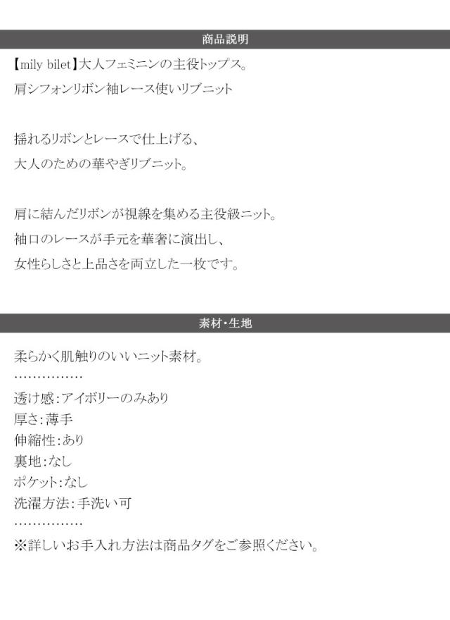 クラシカルエルフ冬新作 mily bilet トップス ニット レディース 長袖 肩 シフォン リボン 袖 レース 使い リブニット 長袖 コンパクト 大きいサイズ 2025aw mi1029170