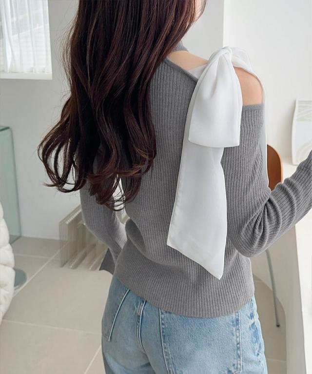 肩に大胆にあしらわれたシフォンリボンが、ふと動くたびに軽やかに揺れて印象的なアクセントに。