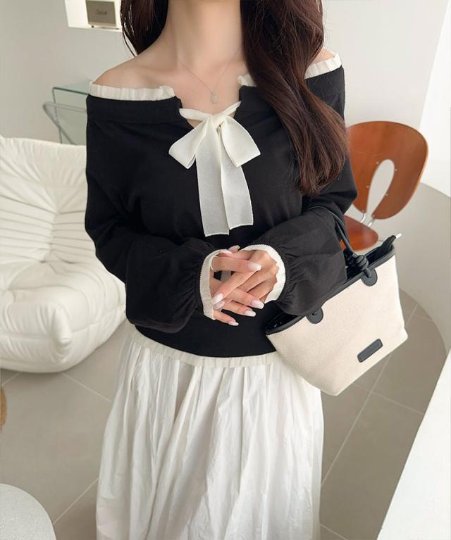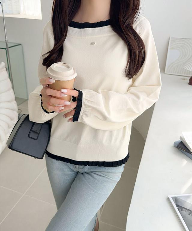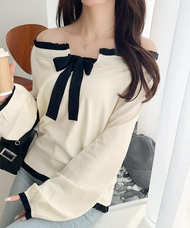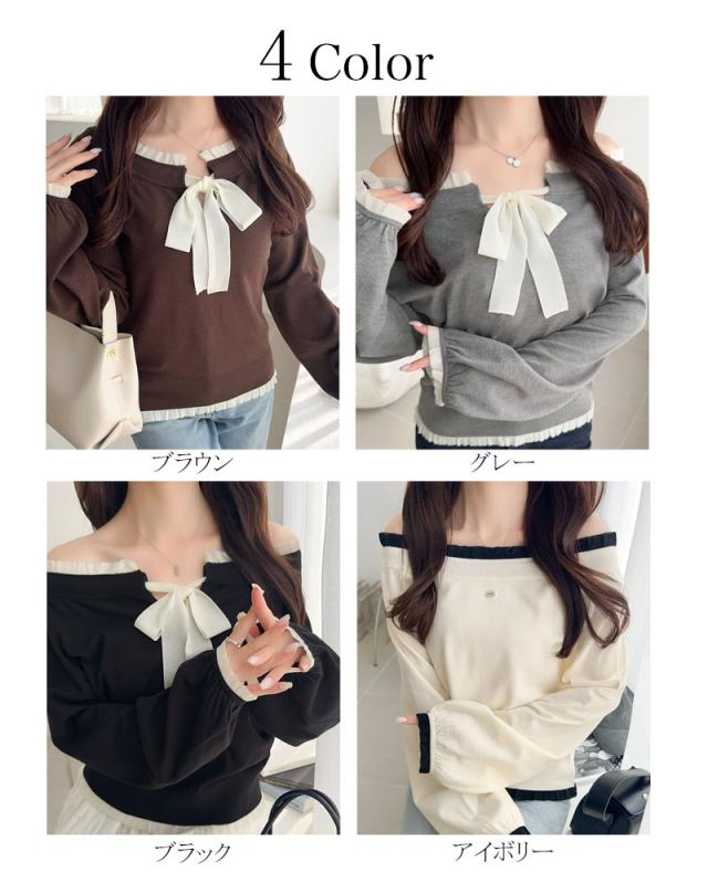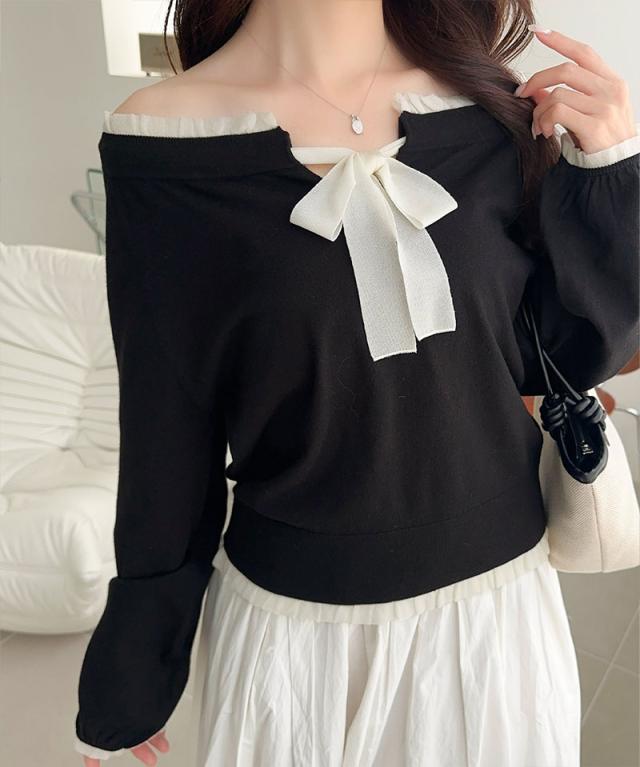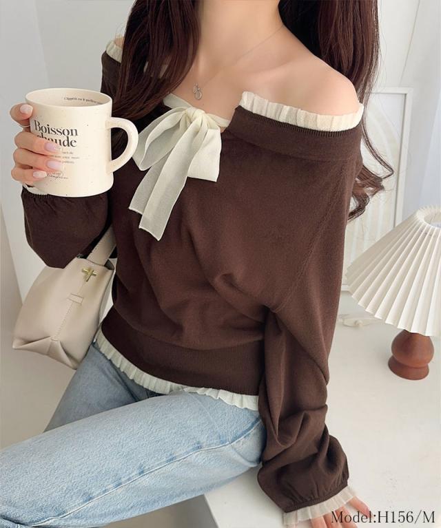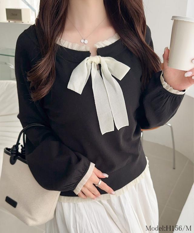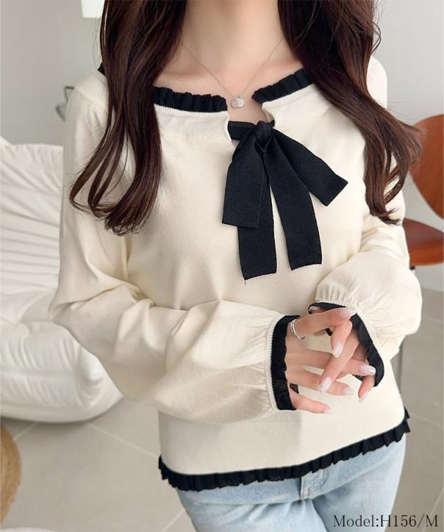 大きめのリボンと裾フリルが華やかさを引き立てる、大人可愛いニットプルオーバーです。