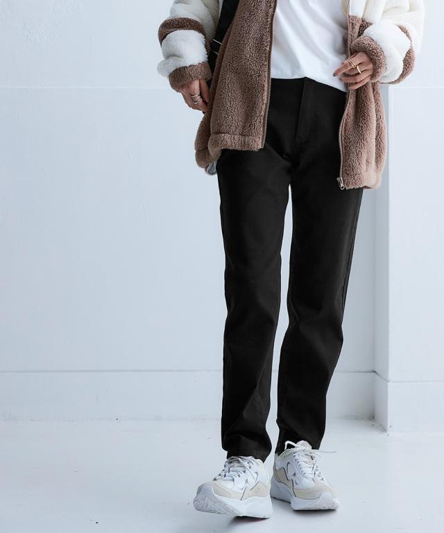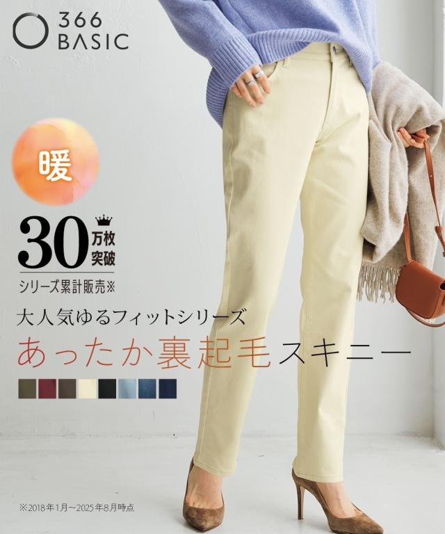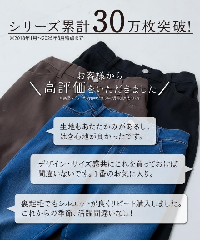 スキニーの美脚効果×テーパードの穿きやすさ 『おいしいトコどり』のこだわりシルエット 「スキニーは細すぎて動きにくい」「テーパードはシルエットが野暮ったくなりがち」そんなお悩みに応える、『ちょうどいい』シルエットのパンツ! スキニーの美しいラインを活かしながらも、テーパードならではのゆとりをプラスすることで、脚をスッキリ見せつつ、動きやすさも確保。スタイルアップを叶えながら、日常使いしやすい万能な一本に仕上げました。 ■素材:裏起毛素材が進化!やわらか&スムーズな履き心地 内側の裏起毛素材は、従来品よりなめらかさが大幅UP! 素肌に触れてもチクチクせずに肌あたりが柔らかく快適です。毛足が短めなので、着ぶくれしにくく、冬場でもスッキリと着こなせます。 素材自体もリニューアル!ゴワつきにくく、穿いた瞬間から心地よさを実感できます。 伸張率をなんと130%UP!ストレッチがしっかり効いているから、屈伸や階段の上り下り、長時間の着用もストレスフリー。しゃがんでも背中が出にくい設計で、安定したフィット感をキープします。 ■デザイン:着脱しやすく見た目すっきり! 前ファスナー付きで脱ぎ穿きラクラク ウエスト後ろ部分はゴム仕様で