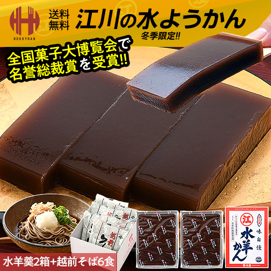 水ようかん 福井 江川 水羊羹 ギフト 520g×2箱 大サイズ 越前そば6食付き 生そば 送料無料 秘密のケンミンSHOWで紹介 冬季限定 お歳暮 御歳暮 ギフト