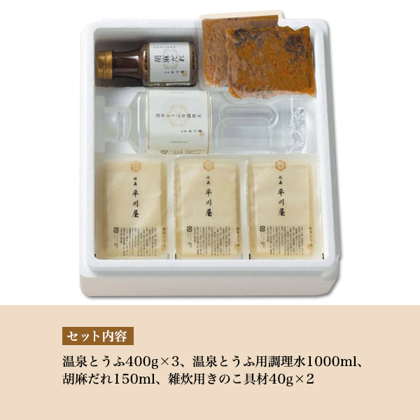 【内容】約3〜4人前/温泉とうふ400g×3、温泉とうふ用調理水1000ml、胡麻だれ150ml、雑炊用きのこ具材40g×2