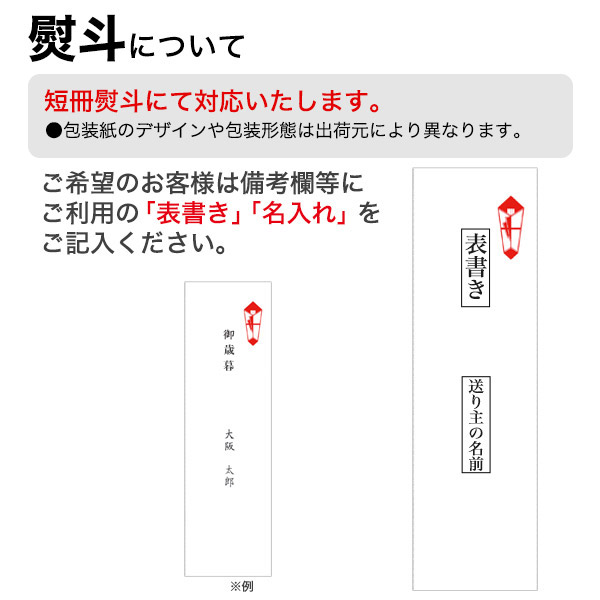 ※ご記入漏れや誤記、又は出荷元によりましては、発送に日数がかかる場合がございますので、ご了承ください。※お届け先様が同じでも2つ以上の商品をご注文の場合は、お届けのタイミングが異なる場合がございます。※のしのサイズや形式は出荷元により異なりますので、選択できません。※ご依頼主様またはお届け主様のご氏名に旧字等が使用されていた場合、一部、印刷可能文字での登録をさせていただく場合がありますので、ご容赦ください。※商品は多数ご用意しておりますが、万が一品切れの際はご了承ください。※商品写真は、現物と多少異なる場合がございます