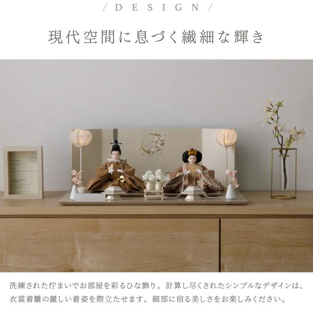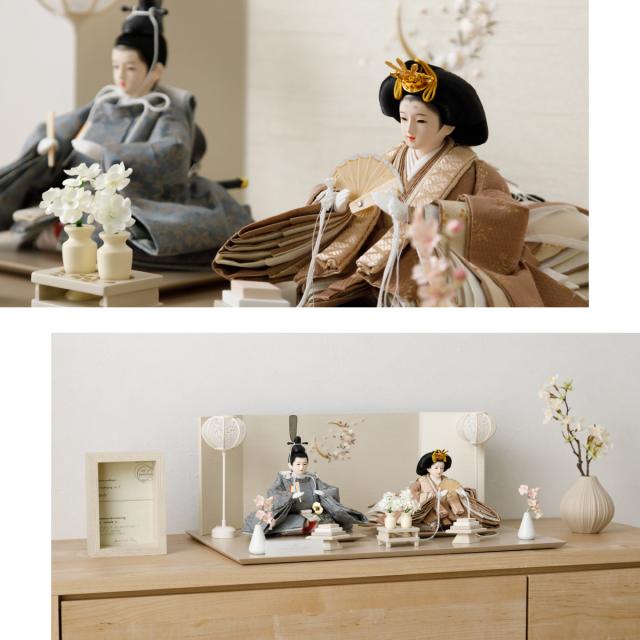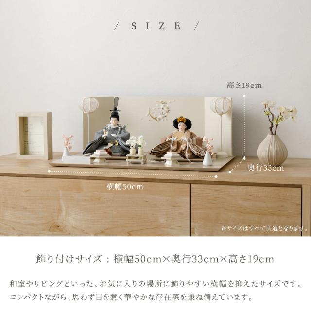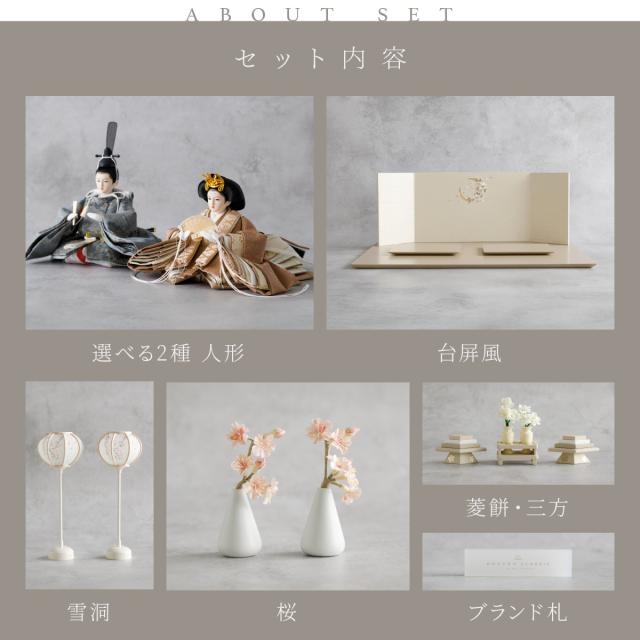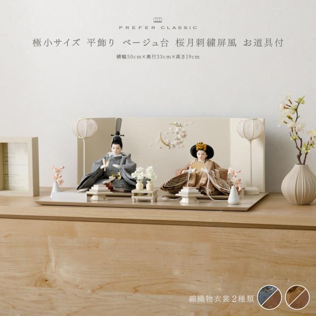 雛人形 高級 PREFER CLASSIC[ベージュ台 桜月刺繍屏風 平飾 道具付 人形極小 選べる綿織物衣裳2種 小夜 耶子] ひな人形 おしゃれ モダン 親王飾り インテリア お雛様 雛 菱餅三方 雪洞 枝桜ピンク 初節句 女の子 ひな祭り