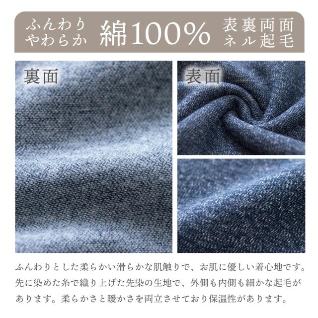 先に染めた糸で織り上げた先染の生地で、外側も内側も細かな起毛があるため保温性があります。