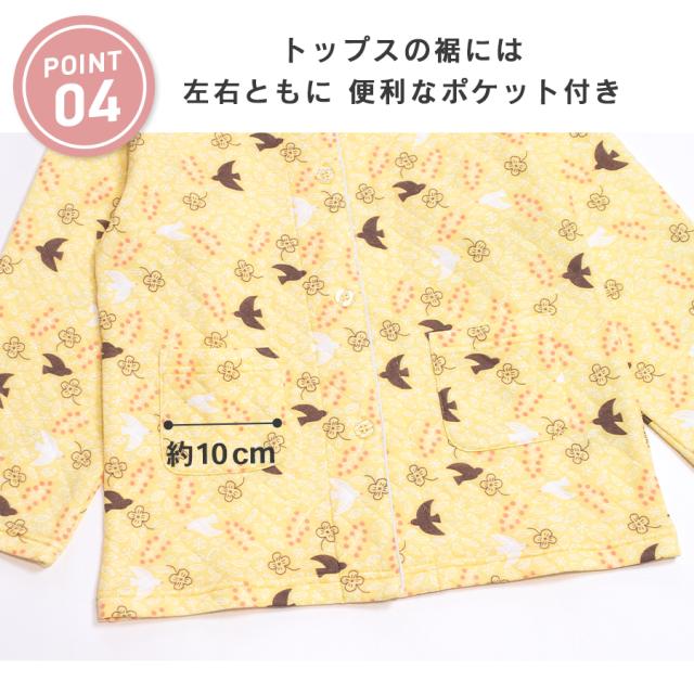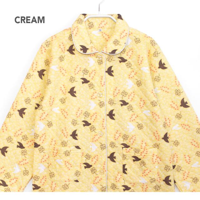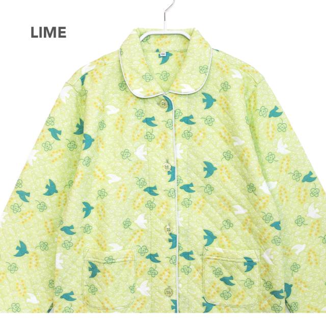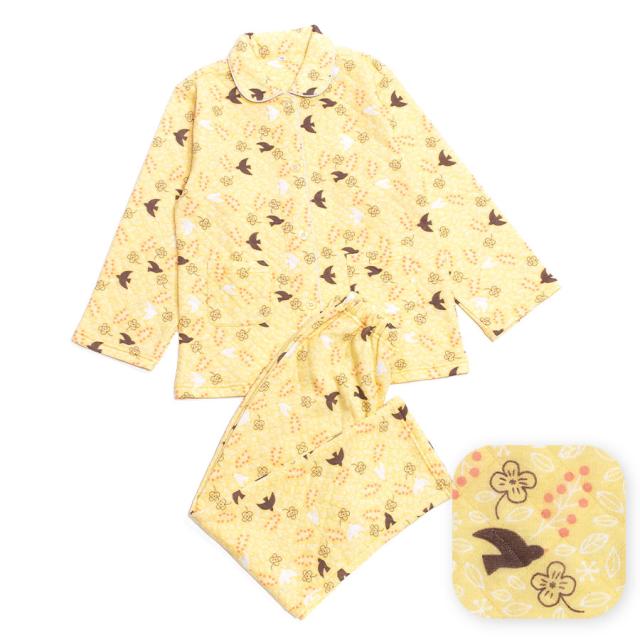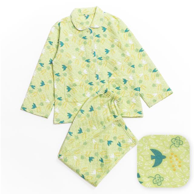 パジャマ キッズ 女の子 内側が綿100% 長袖 冬 ふんわり柔らかなニットキルト 前開き ボタン シャツ 小鳥柄 ライム クリーム 120 130 140 150 160 子供 ガールズ ジュニア 親子 おそろい リンクコーデ 81249