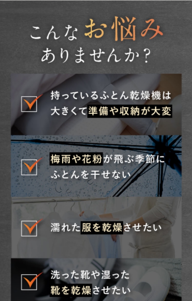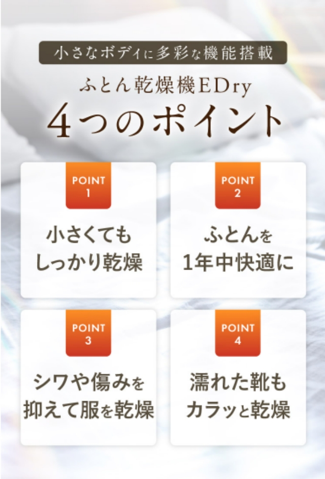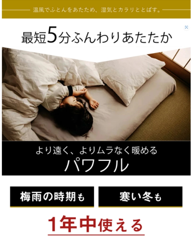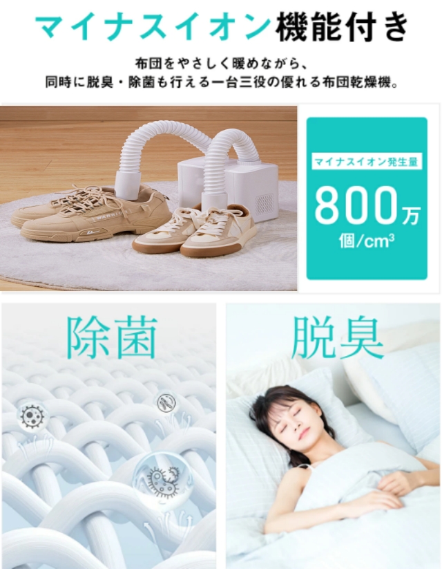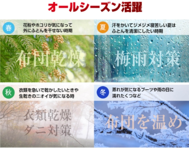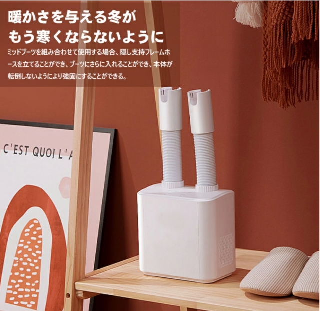 ・【一台多役乾燥機】冬場は布団を温めるほか、梅雨時には布団を乾かすほか、部屋干しの洗濯物を乾かすのにも使えます。寝る前に温めておいた布団もふかふかで、気持ちよさそうに眠っています。「布団」の他に「靴」乾燥も可能で便利な1台3役。スニーカーやブーツ、革靴にも対応。