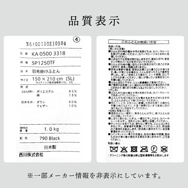 [keyword | 羽毛掛け布団 合掛け シングルロング 150×210 日本製 西川 イギリス産 ホワイトダック ダウン90 フェザー10 1.0kg 立体キルト ダウンプルーフ バイオアップ 抗菌 清潔 透湿 保温 軽量]