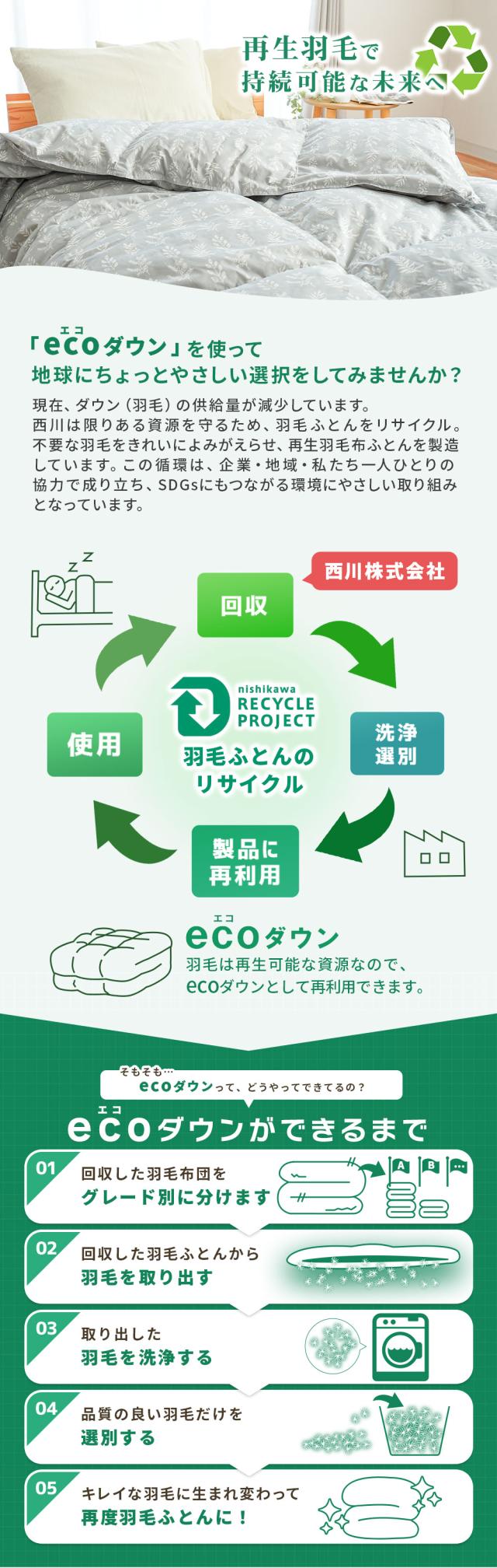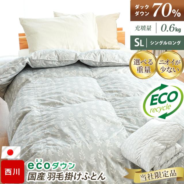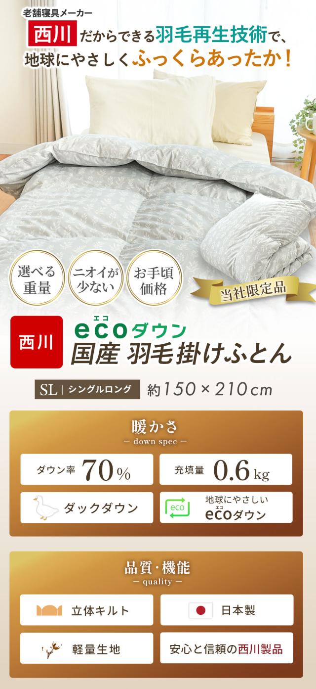 【〜12/15 10%offクーポン対象】西川 羽毛布団 シングル 日本製 ecoダウン エコダウン ダックダウン70% 再生羽毛 0.6kg 合い掛け シングルロング 国産 150×210cm 暖かい 羽毛ふとん 合掛け 掛け布団 冬用 冬 エコ サステナブル あったか 当社限定