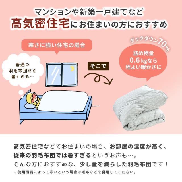 ・「ecoダウン」で地球にちょっとやさしい選択を ダウン(羽毛)の供給量が減少している現在、限りある資源を守るために羽毛ふとんをリサイクル。不要な羽毛をきれいによみがえらせて再生羽毛布ふとんを製造。企業・地域・私たち一人ひとりの協力で、SDGsにもつながる環境にやさしい取り組みです。 ・高気密住宅にお住まいの方におすすめマンションや新築一戸建てなどの高気密住宅では、お部屋の湿度が高く、従来の羽毛布団では暑すぎるという声も。そんな方には、詰め物量を少し減らした羽毛布団がおすすめです。 ・はじめての羽毛布団にもおすすめ!再生羽毛のecoダウンを使用程よいあたたかさのダウン率70%。芯がなくふわふわのダウン(羽毛)で快適な寝心地。新毛よりも洗浄の回数が多いため、清潔で臭いの少ないダウンに仕上がっています。 ・暖かさを逃がさない立体キルト羽毛の持つふくらむ力を最大限に活かすため、小部屋を立体的に作ったキルト構造を採用。暖かい空気をしっかり閉じ込めて、朝まで快適な眠りをサポートします。 ・再生羽毛でも安心!より美しく、国内洗浄業界水準の2倍、洗浄度1000mmの高水準で仕上げた清潔な羽毛を使用。汚れや脂分をしっかり落とし、快適でにおいの少ない羽毛本来のふくらみを実現します。 ・創業450年以上の信頼。安心の高品質、西川製品西川の厳しい基準のもと、羽毛布団から取り出したダウンをリサイクル・洗浄して使用。長年の信頼と実績に支えられた高品質なものづくりで、安心して使える商品です。 ・当社限定デザイン!軽くて快適な綿混生地植物をモチーフにした北欧調のオーガニックなオリジナルデザイン。ポリエステル繊維にコットンを配合して吸湿性をプラス。素朴でかわいい北欧模様が魅力です。 |