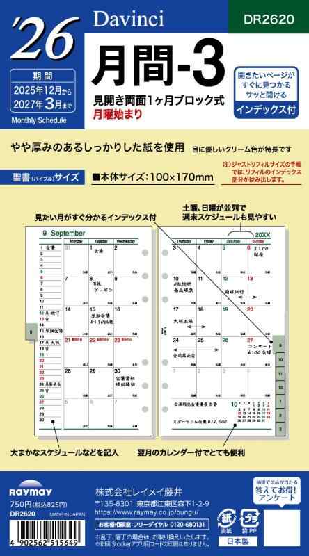 レイメイ藤井 手帳 システム手帳 リフィル 2026 バイブルサイズ ダヴィンチ (月間3(ブロック式横インデックス付き))