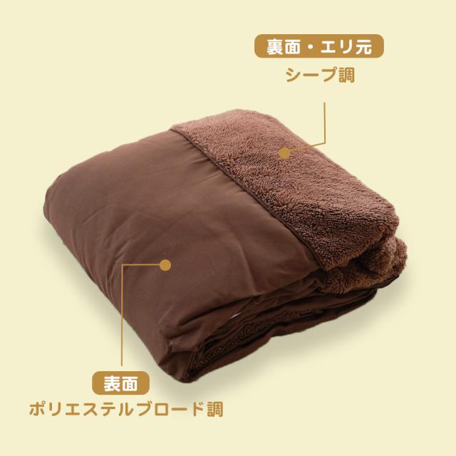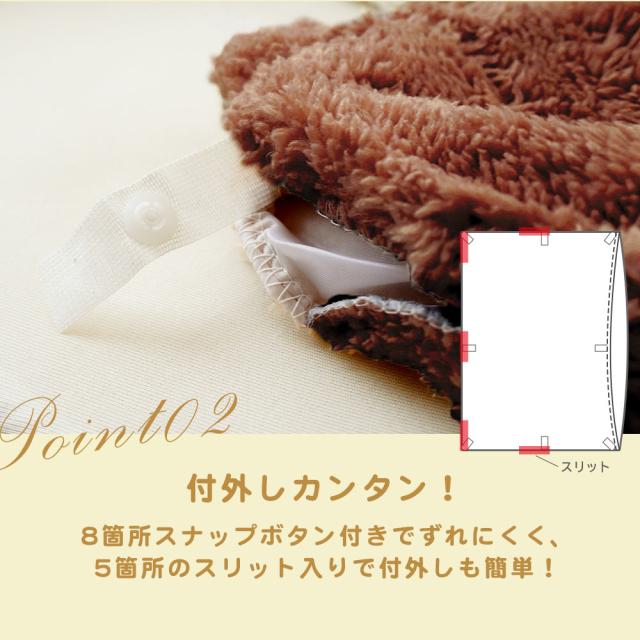・裏面・襟元はモコモコシープ調 裏面には毛布のようなボアを使用。カバーを変えるだけでいつものお布団が、ふっくらとあたたかな使い心地に! ・シンプルデザイン表面は無地のシンプルデザインなので、どんなお部屋にも馴染みやすい! ・着脱カンタン&ずれにくい!ふとんがズレにくい8箇所スナップボタン付き&5箇所のスリット入りで、着脱も簡単! ・毛布としても使える、2WAYタイプ中にふとんを入れず毛布としても使えます。真冬は羽毛布団のカバーとして、秋から冬にかけては毛布としても。 ・毛羽防止内袋入り内側は毛羽防止内袋で摩擦を軽減!ややフィット感は損ないますが、お布団の毛玉が気になる方にオススメです。 |