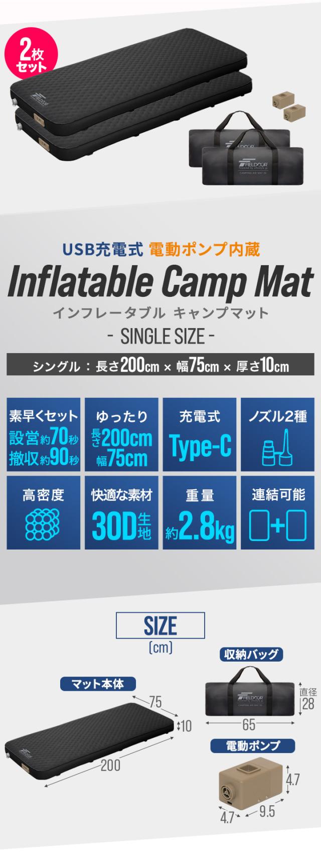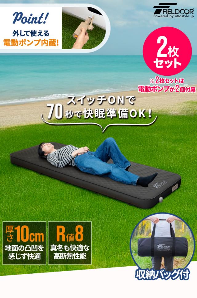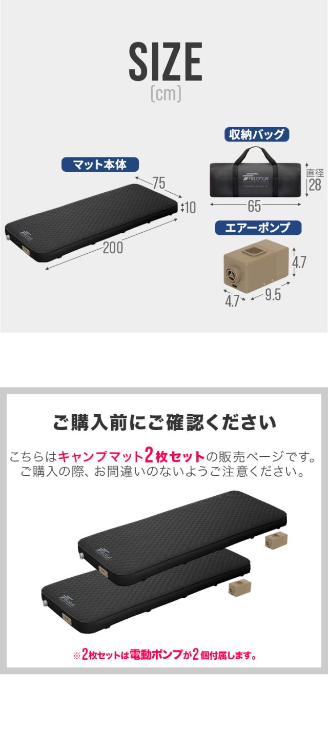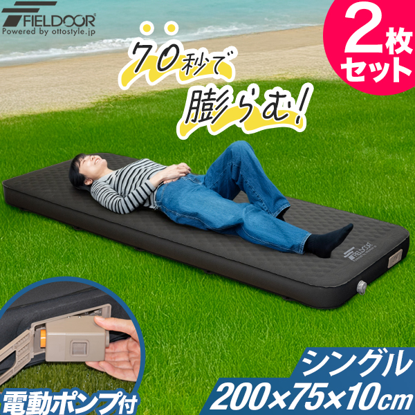 FIELDOOR キャンプ マット シングル 2個セット 極厚 エアーマット インフレータブルマット 電動ポンプ付 断熱 厚さ10cm 幅75cm×200cm 送料無料