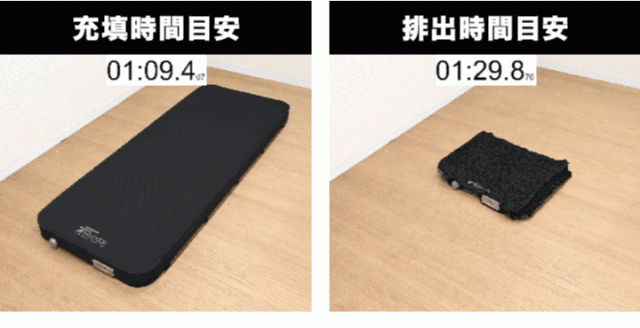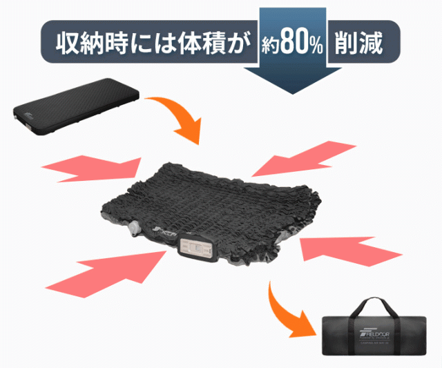 キャンプマットは、電動ポンプのスイッチをスライドするだけで簡単に膨らみます!収納時も、排気側にスライドするだけでOK!約200cm×75cmの広々サイズながら、 特殊ハニカム構造により、 驚くほどコンパクトに収納できます。