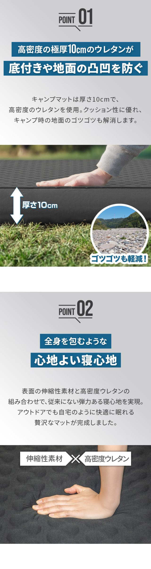 キャンプマットは厚さ10cmで、 高密度ウレタンフォームを使用。クッション性に優れ、 キャンプ時の地面のゴツゴツも解消します。