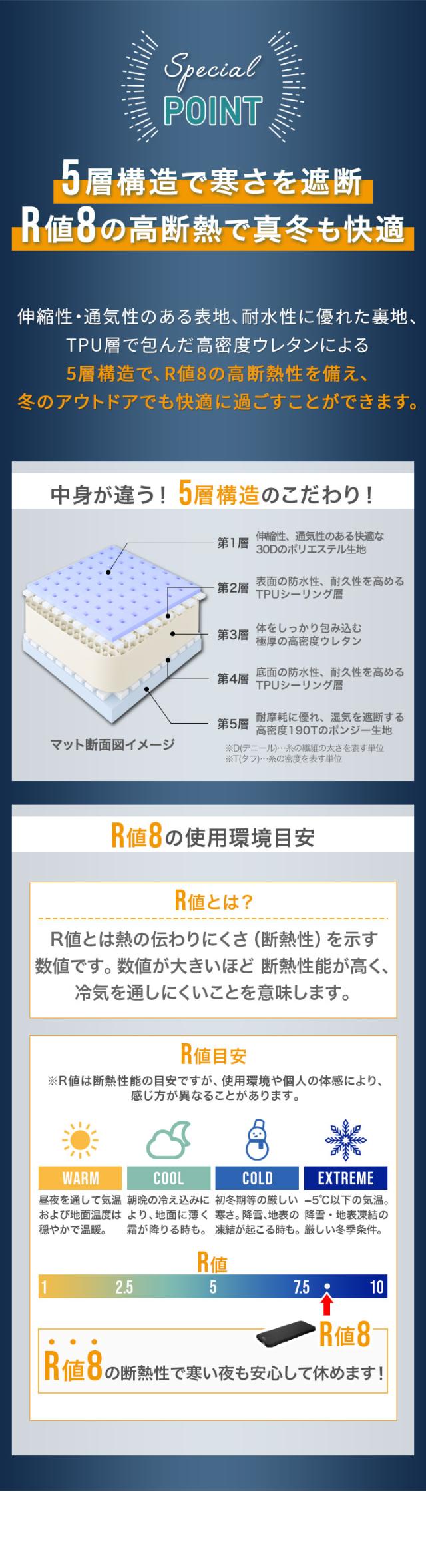 伸縮性・通気性のある表地、耐水性に優れた裏地、TPU層で包んだ高密度ウレタンによる5層構造で、R値8の高断熱性を備え、冬のアウトドアでも快適に過ごすことができます。