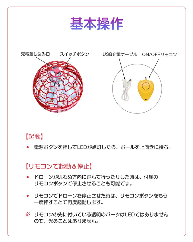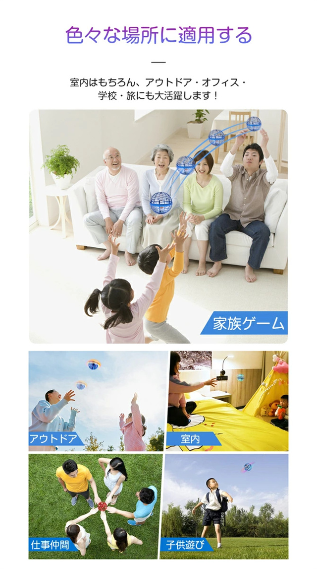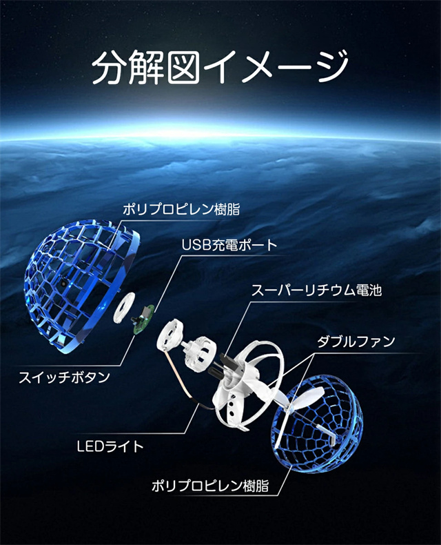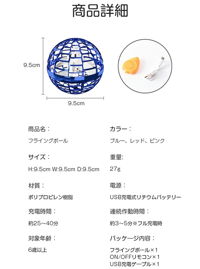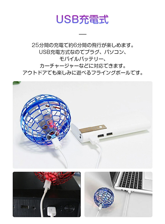 | ポイント | 【球体デザイン】 従来のドローンと異なる球体ドローン! 複雑の操作がないので、より簡単に新しい遊び方が楽しめます。 【カラフルなLEDライト】 多彩なLEDライトが点灯するので、フライングボールがキラキラと回転します。 特に夜間や暗い場所では、さらに綺麗に宙を舞います。 【優れた素材】 無害で軽量、衝突耐性に優れたポリプロピレン樹脂素材を使用しているので、壁や床を傷付けにくいので安心です。 【USB充電式・携帯便利】 充電は開始から約25〜40分間でフル充電、約3〜5分間の飛行時間を確保できます。USB充電方式なのでプラグ、パソコン、モバイルバッテリー、カーチャージャーなどに対応できます。アウトドアでも楽しみに遊べるフライングボールです。 |