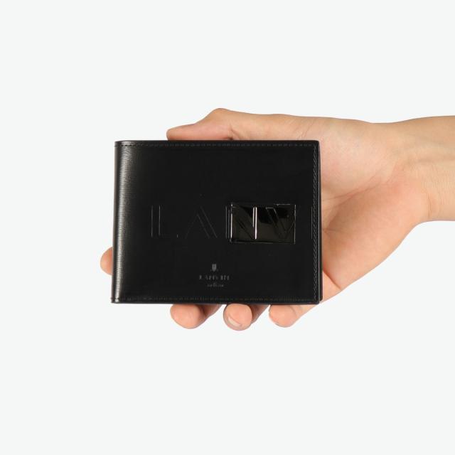 LANVIN en Bleuの楽しさを表現した小物シリーズ『ディアブロ』の二つ折り財布。立体的な型押しロゴと金具プレートと繋がっているように見えるデザインが印象的。ロゴはさらに背面へと回り込み、存在感とデザイン性を際立たせています。素材には細かな型押しが施されているため、傷がつきにくいのも魅力です。