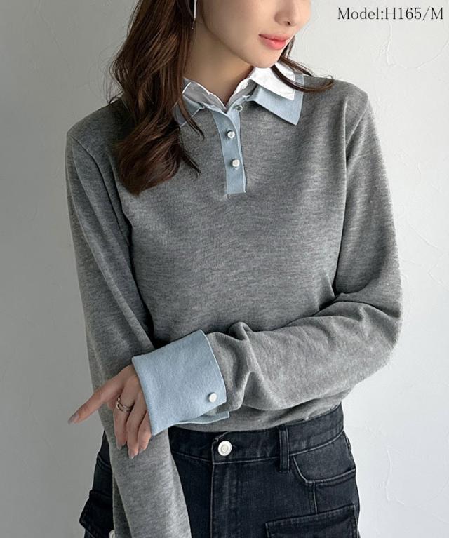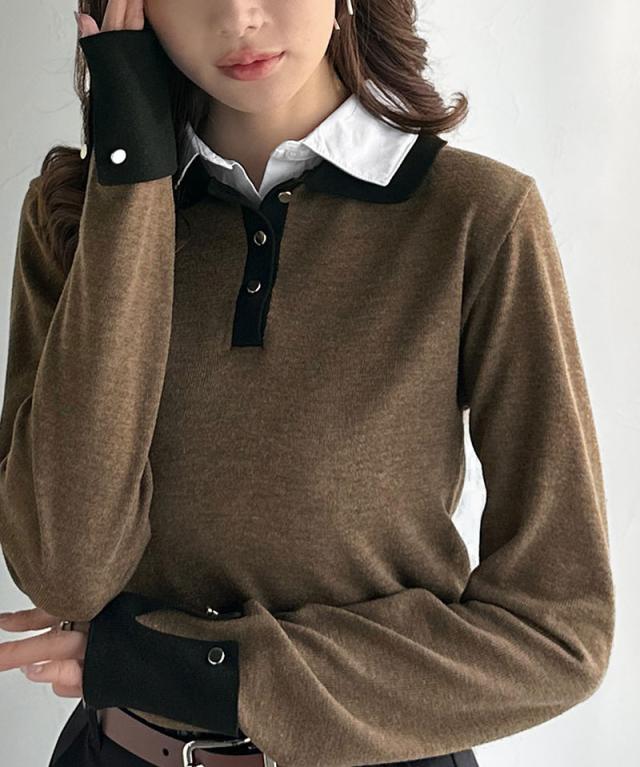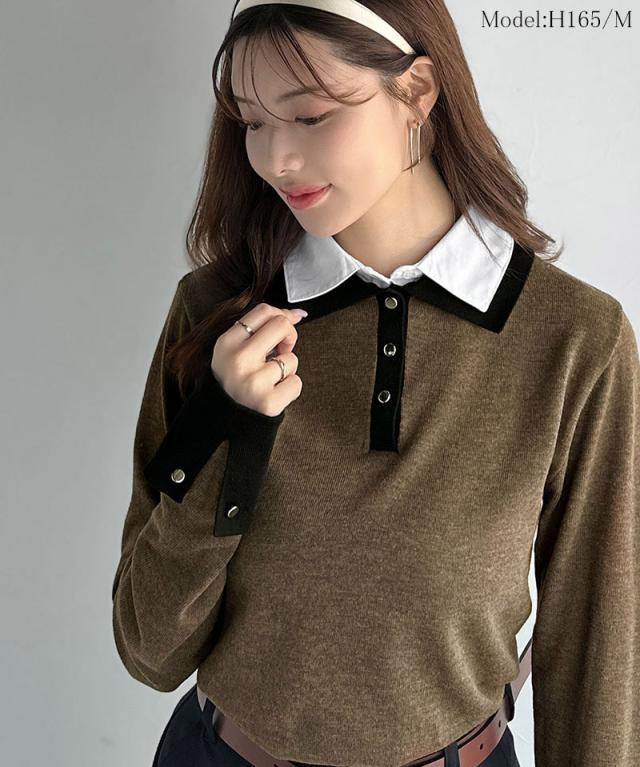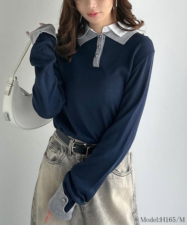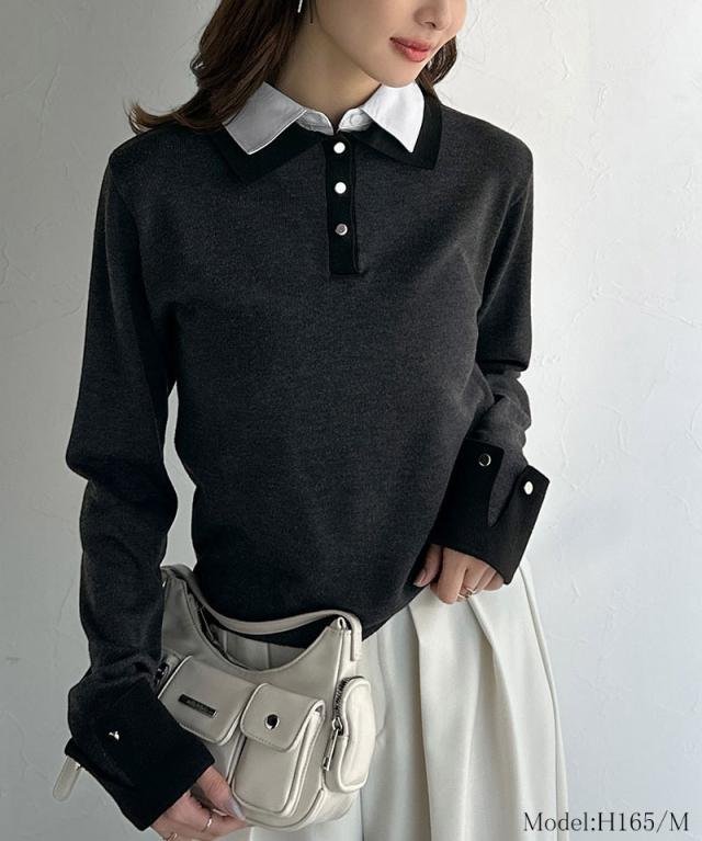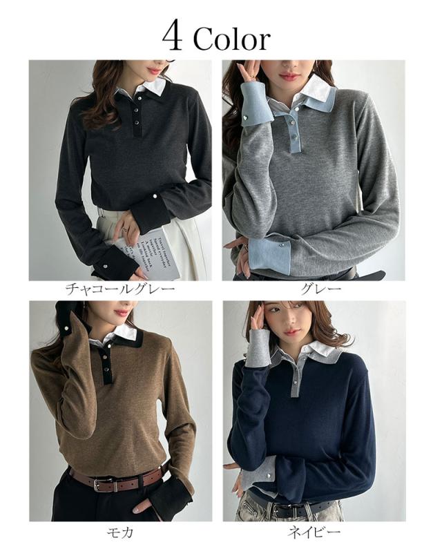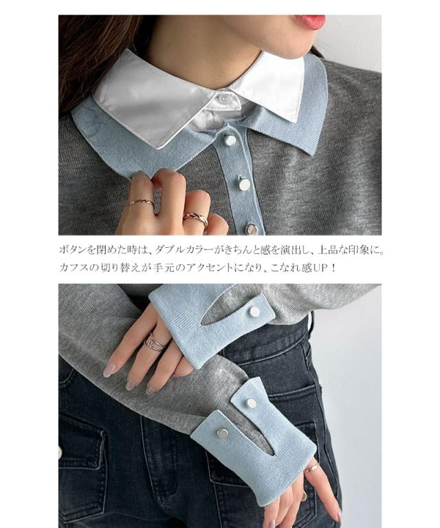 クラシカルエルフ冬新作 mily bilet ニット レディース 長袖 トップス プルオーバー 長袖 レイヤード風 シャツダブル襟 カフス切り替え 華やか ダブルカラー 布帛 抜け感 デイリー シンプル キレイ見え 華奢魅せ効果 大きいサイズ 2025aw mi1029159