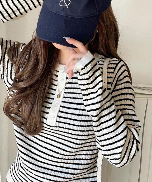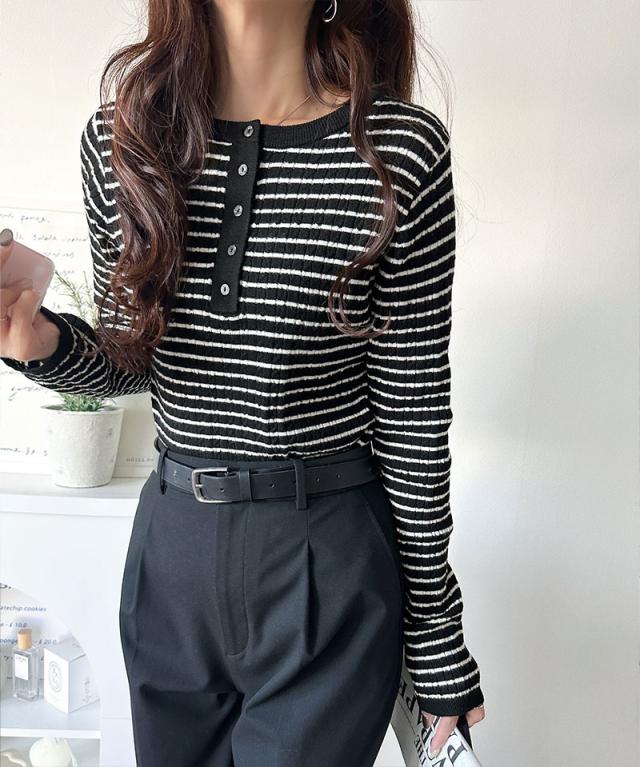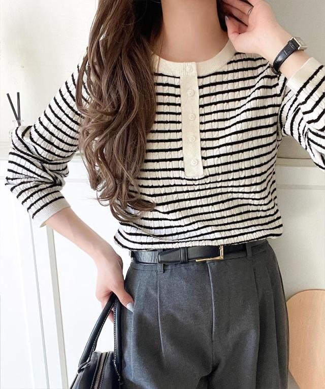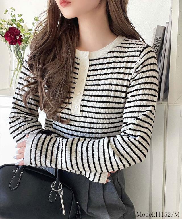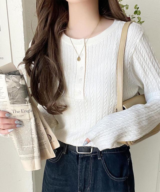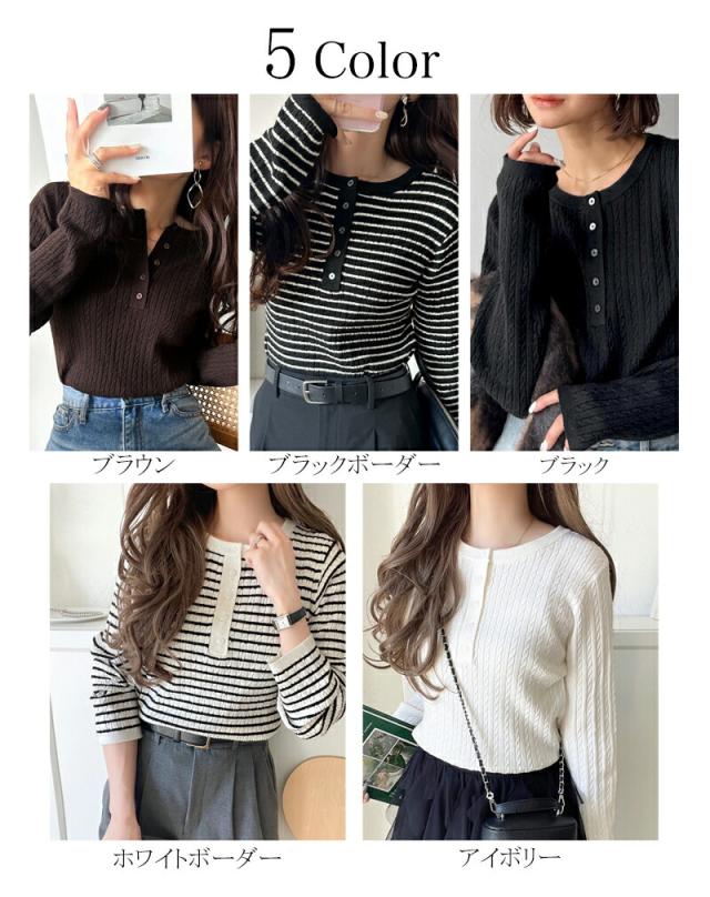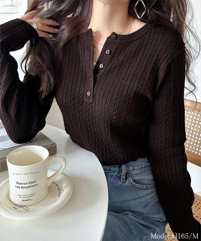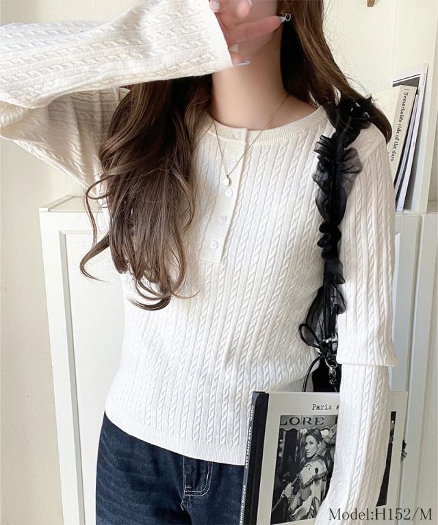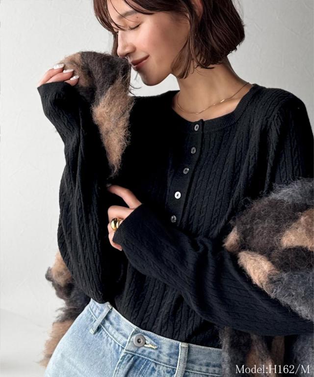 襟元のボタン使いがアクセントのミニケーブルヘンリーネックニット。