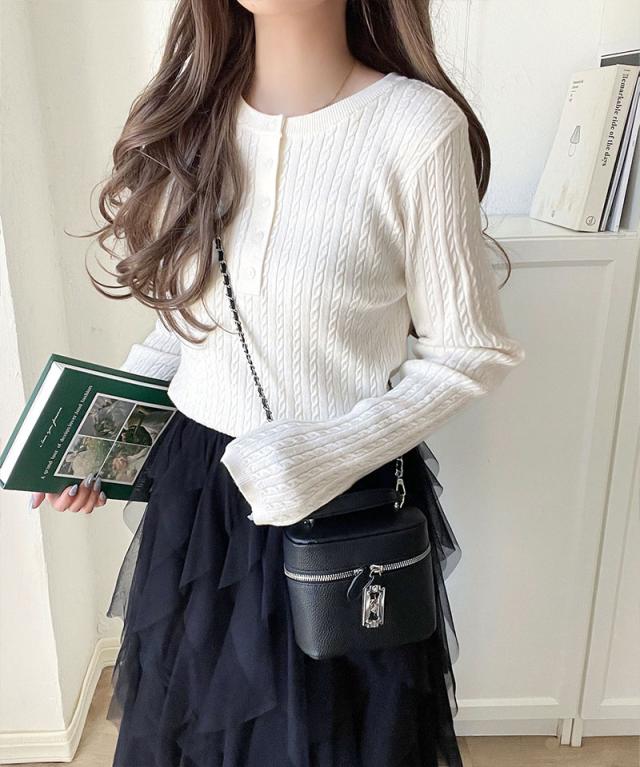 トレンドのミニケーブル編みが、シンプルながらもおしゃれな印象を与えます。