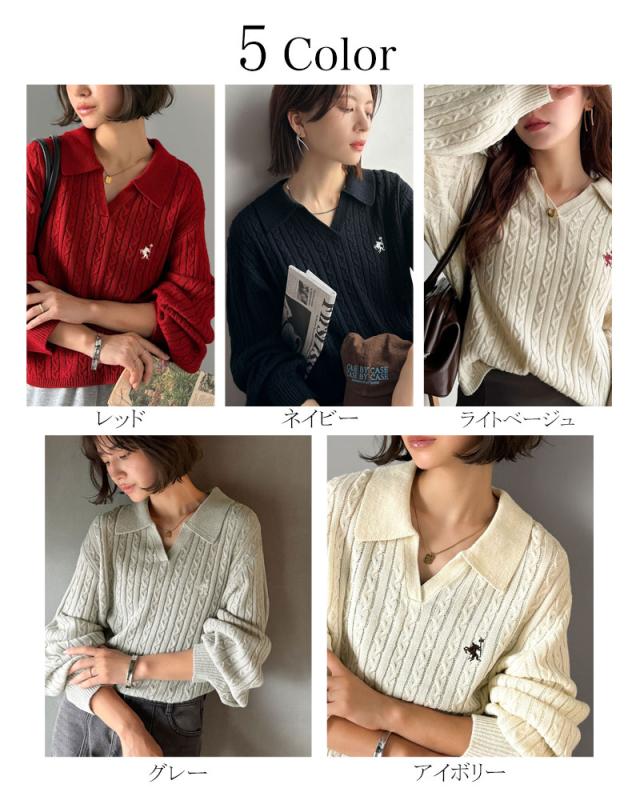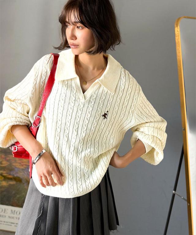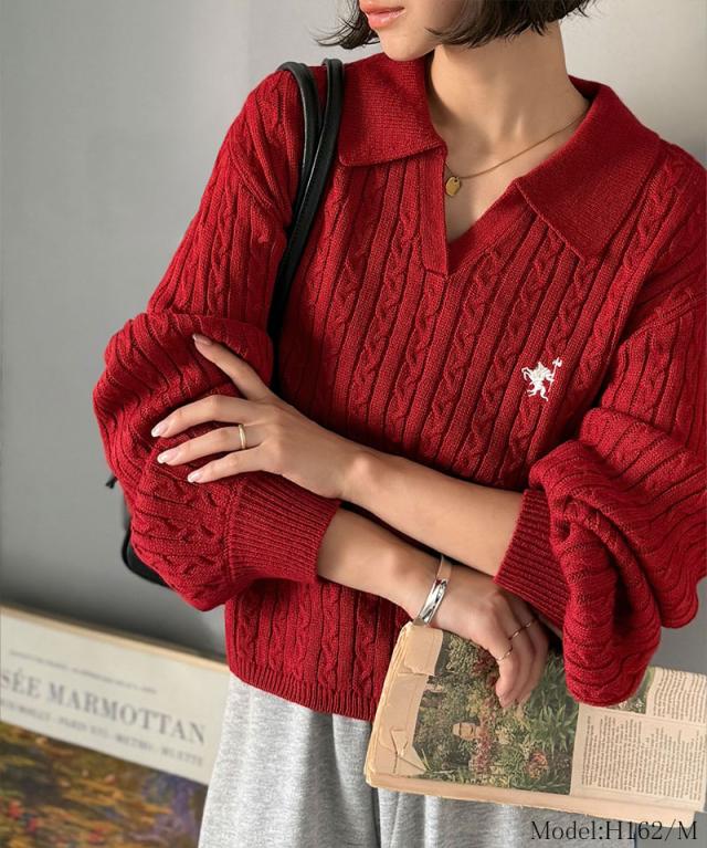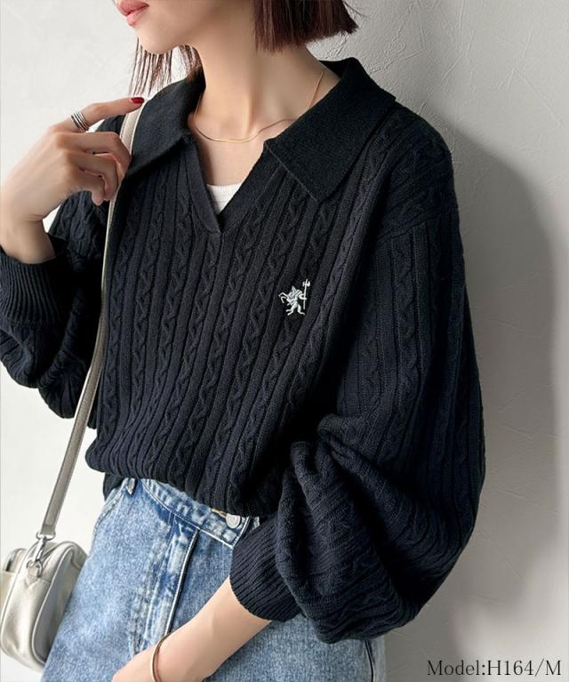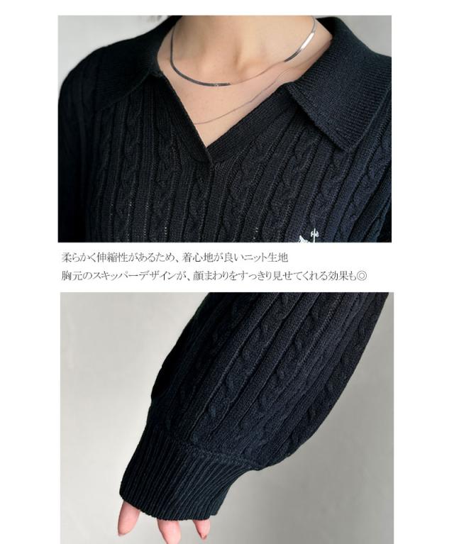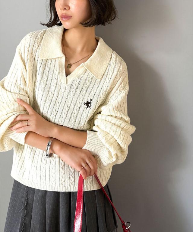 クラシカルエルフ冬新作 ニット レディース 長袖 トップス 品よく華やぐ 胸 刺繍 ケーブル 編み ポロ 襟 スキッパーニット ボリューム 袖 長袖 ゆるっと オーバーサイズ 大きいサイズ 2025aw ce1050308