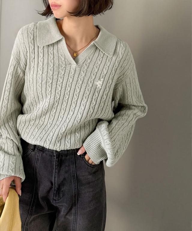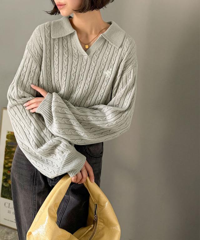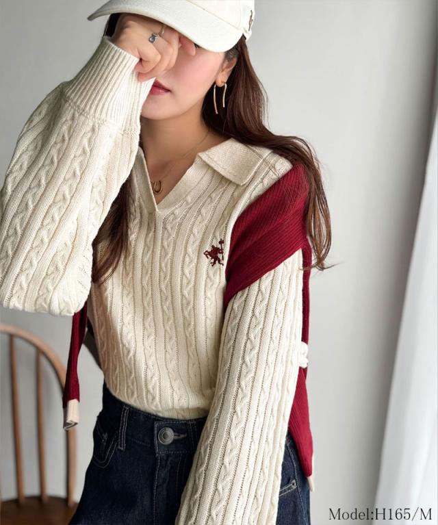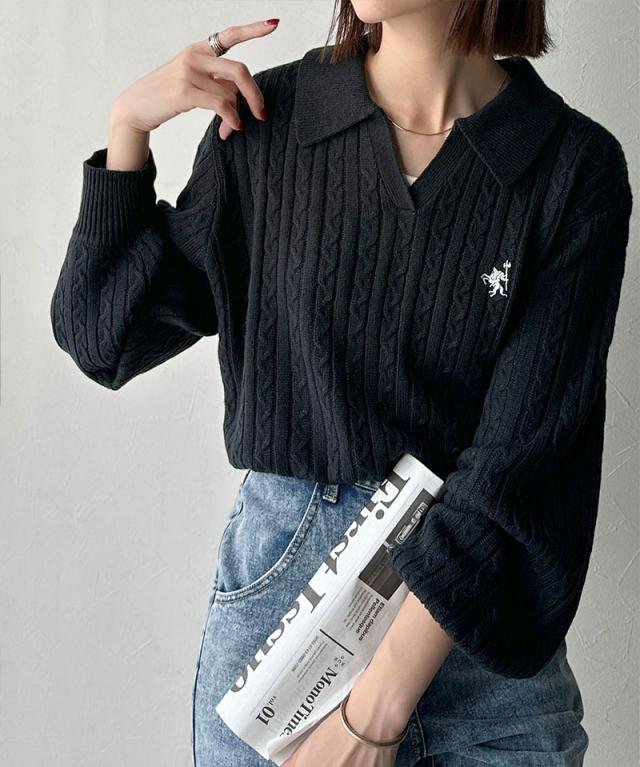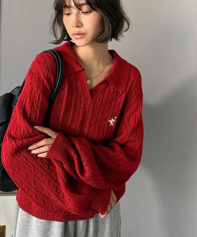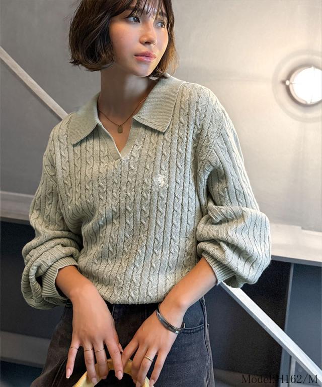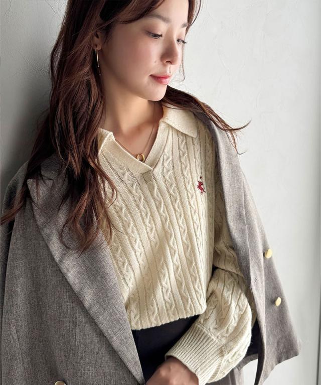 クラシカルエルフ冬新作 ニット レディース 長袖 トップス 品よく華やぐ 胸 刺繍 ケーブル 編み ポロ 襟 スキッパーニット ボリューム 袖 長袖 ゆるっと オーバーサイズ 大きいサイズ 2025aw ce1050308