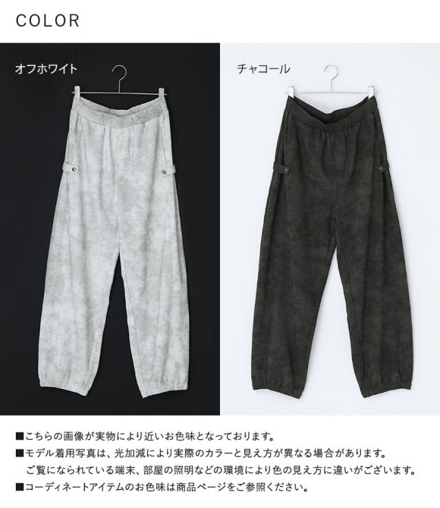 ■デザイン ピグメント風のプリント加工を施したバルーンシルエットのパンツ。膝まわりにゆとりを持たせ、裾に向かって細くなるバルーンシルエットが、脚のラインをきれいに見せつつ、リラックス感のあるはき心地を実現。さらにサイドのスナップボタンでシルエットに変化をつけることができます。 ■コーディネート パンツのボリュームがあるので、トップスはジャストサイズからオーバーサイズでもバランスが取りやすく、また同素材のジップアップパーカーとセットアップで着用すれば、トレンド感のあるカジュアルスタイルが完成します。 ■素材 ポンチ素材を使用し、裏面をボンディング加工することで、なめらかでハリのあるしっかりとした生地感に仕上げました。表地と同じ色味のリブを使用したウエストと裾ゴムで絞ったバルーンシルエットが全体的に纏まりをもたせ、大人感のあるアイテムとして着用できます。 ■製品についての注意書き 染色の特質上、発汗や摩擦により色落ちすることがありますのでご注意ください。 また、着用中の摩擦により色移りしやすい特性がありますので、白や淡色との組合わせはご遠慮ください。 他の製品に色が移ることがありますので、一緒に洗わず単独で洗ってください。 ご了承の上、ご購入いただきますようお願いいたします。 |