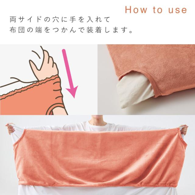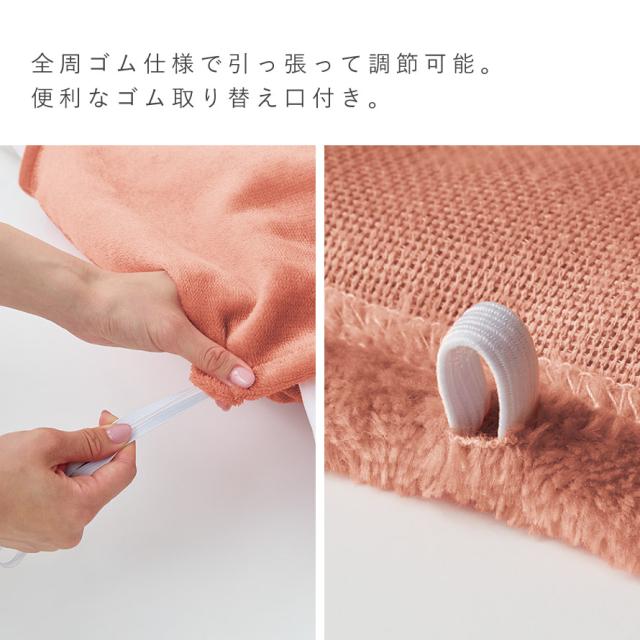 掛け布団の衿部分に被せるだけの簡単取付。両サイドの穴に手を入れて布団の端をつかんで手前に引きます。衿カバーは全周ゴム仕様。ゴムを引っ張ってフィット感を調節できずれにくく使えます。便利なゴム取り替え口付き。
