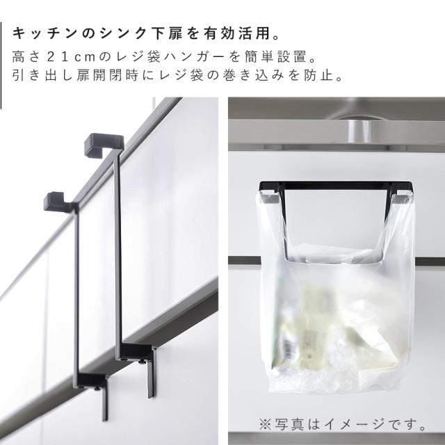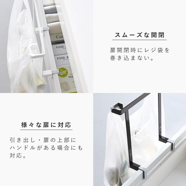 キッチンのシンク下扉に簡単に設置できる、高さ21cmのレジ袋ハンガーです。レジ袋を引っ掛けるだけで使用でき、引き出し開閉時の巻き込みを防止。
