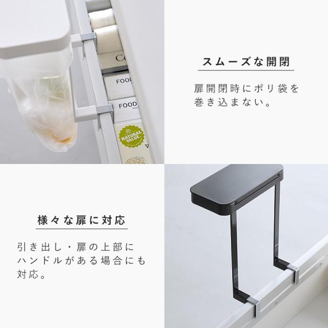 キッチンのシンク下扉に簡単に設置できる、高さ21cmのポリ袋ホルダーです。引き出しや扉の開閉時にポリ袋の巻き込みを防止。