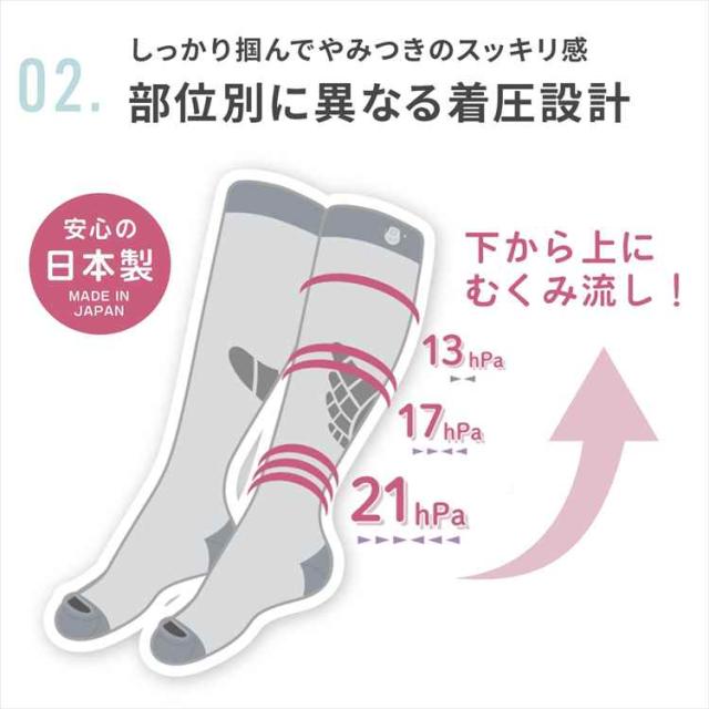 ふくらはぎから足首にかけて徐々に強くなる、部位ごとに異なる着圧設定。下から上にじっくりとむくみを流してくれます。安心・高品質の日本製。