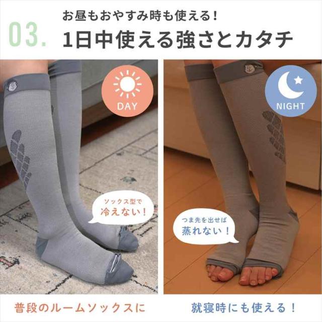 つま先は普通の靴下と同じようにも、オープントゥソックスとしても使用可能な2WAY仕様。日中の冷え防止ルームソックスとしても、蒸れが気になるおやすみ時にも、一日中使える着圧ソックスです。