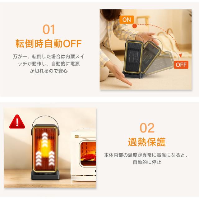 1. 転倒自動OFF機能:地震や不意の衝撃でヒーターが転倒した場合でも、自動的に電源を遮断します。